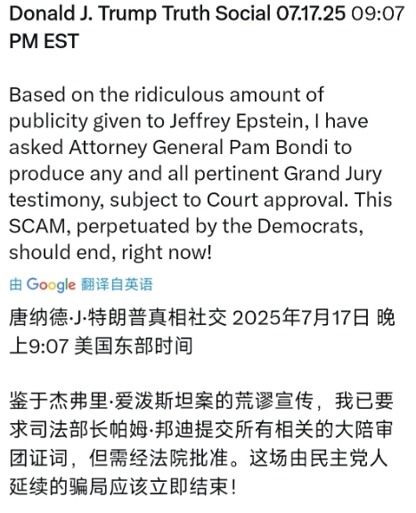 突发新闻:特朗普今天(北京时间7月18日)写道:“鉴于杰弗里·爱泼斯坦案的荒谬宣传,我已要求司法部长帕姆·邦迪提交所有相关的大陪审团证词,但需经法院批准。这场由民主党人延续的骗局应该立即结束!”