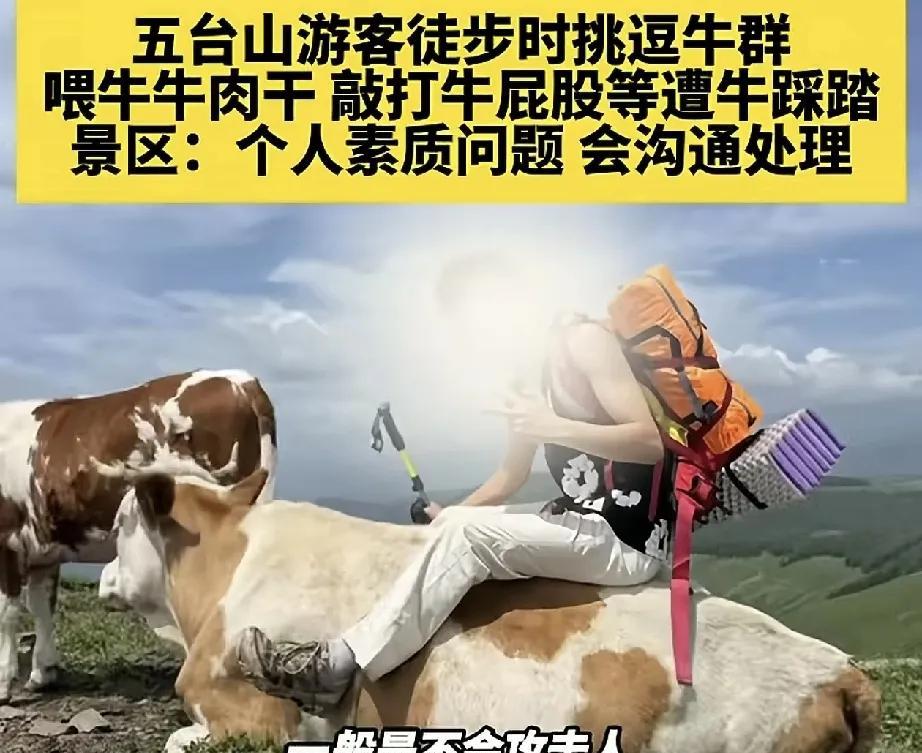 五台山,两名男子在此徒步时故意挑逗牛群,期间他们又是喂牛牛肉干,又是用登山杆敲打牛的,最终将牛群激怒,其中一个人也是遭到牛群的反击,被牛撞倒后对其进行了踩踏。 现场视频可见,一名男子在牛群前,用登山杆敲打牛,而另一名男子则坐在牛身上拍照。镜头一转,牛群躁动的踩踏了那位骑在牛背上的男子,看得出来,男子也被牛踩踏得不轻。 据五台山工作人员回应,这些牛也并非无缘无故的攻击他们。因之前他们就拿牛肉干喂牛,然后牛就将其登山杆踩断了,然后他们又用登山杆不断敲打牛,最终牛被激怒后,才发生了这起踩踏事件。 工作人员还表示,一般正常情况下这牛是不会主动攻击人的,关键还是个人素质问题,目前景区正在与被踩踏者沟通处理此事。 而此事被发到网上后,也是引起了网友们的一片热议。 有网友就表示:看得出来牛很憋屈。他们打它时它忍了,他们骑它时它也忍了,但是他们喂它牛肉干时,无需再忍了。这次我站牛这边。 还有网友表示:我小时候去屠宰场把带牛血的芭蕉叶拿去给买牛场的牛闻,牛瞬间就发狂了,结果被我妈痛打一顿。这些人真是既没素质又没常识,这下好了,被牛好好的上了一课。 更有网友表示:牛还会“群殴”,真是第一次见,不过男子被牛教训得不冤,这次我也站在牛这一边。 看来万物皆有情绪啊,本是很温顺的牛,硬是被几人的不道德行为给激怒了。正所谓不作不死,这下好了,被牛踩那哥们,估计以后见牛都有阴影了吧。 所以说,出门游玩时,不但要文明出行,遵守景区的规章制度,对自然万物更应该保持一颗敬畏之心! 对此大家怎么看?