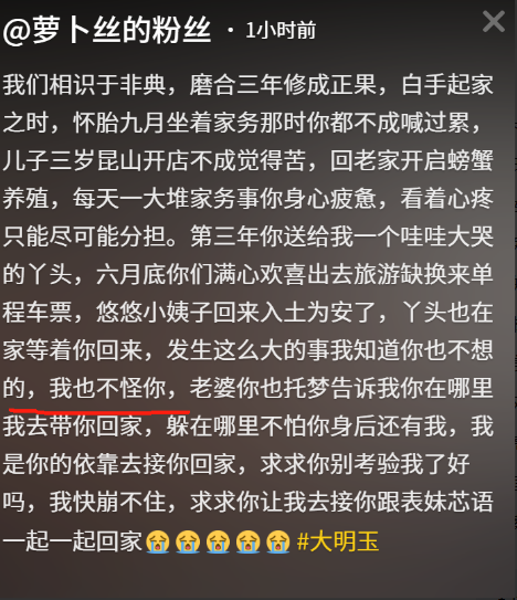 明玉老公今天发抖音,求大明玉托梦给他,让她早日回家。两口子白手起家,一儿一女,如今妻子和女儿出了意外,只剩儿子和他了,一个家庭就这么分崩离析了,悲剧啊。