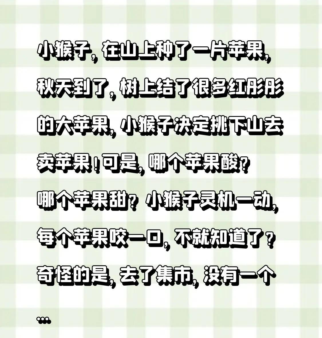 小猴子,在山上种了一片苹果,秋天到了,树上结了很多红彤彤的大苹果,小猴子决定挑下山去卖苹果!可是,哪个苹果酸?哪个苹果甜?小猴子灵机一动,每个苹果咬一口,不就知道了? 奇怪的是,去了集市,没有一个人买小猴的桃子,人们还纷纷嘲笑小猴。 小猴,百思不得其解,自己的苹果个个甜,怎么就没人买呢?