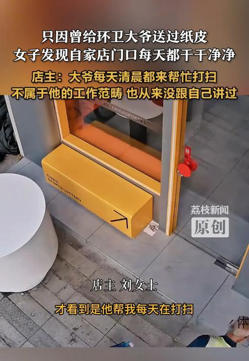 “赚翻了!”河南信阳,女老板店铺装修期间,给路过的环卫大爷送了一次纸壳,此后,她发现店门口特别干净,好像每天都有人打扫一样。直到店铺开业后,女子安装了监控,这才发现就是那位环卫大爷打扫的,而且大爷也没有再要过纸壳!网友:大爷是个讲究人。 一堆废纸壳,对于开店做生意的女子来说值不了几个钱,因此她也没想到,自己的这一个小举动,能带来这么大的影响。 7月18日,媒体报道了这件事情。当时刘女士的店铺刚开始装修,定了一大批材料,产生的垃圾自然也不少,就全都堆在了店门口,打算等到最后一起收拾掉。 有一天,一名环卫大爷路过,刘女士全当做好事,就将没有用的废纸壳都送给了大爷,随后大爷就离开了。 本以为二人就是一面之缘,没想到大爷此后每天都会过来,当然,刘女士对此毫不知情。 第二天一早,刘女士来到店里继续搞装修,令她疑惑的是,门口堆放的装修垃圾全不见了! 之后的每一天早上,刘女士来店铺时,都发现门口干干净净的,好像有人专门打扫过一样。终于,店铺装修好了,开始了正常营业,刘女士就在门口安装了监控。 这回,终于让她找到了那名好心人,正是当时的环卫大爷。据刘女士了解,大爷并不负责这一块的卫生,他是每天专门过来打扫的,而且大爷也没有再问自己要过纸壳,她十分的感动! 网友表示,这何尝不是双向的奔赴呢,刘女士种下的善因,最终得到了回报。 大家对于这件事是怎么看的? 信息来源:《只因曾给环卫大爷送过纸皮,女子发现自家店门口每天都干干净净 店主:大爷每天清晨都来帮忙打扫,不属于他的工作范畴,也从来没跟自己讲过》荔枝新闻