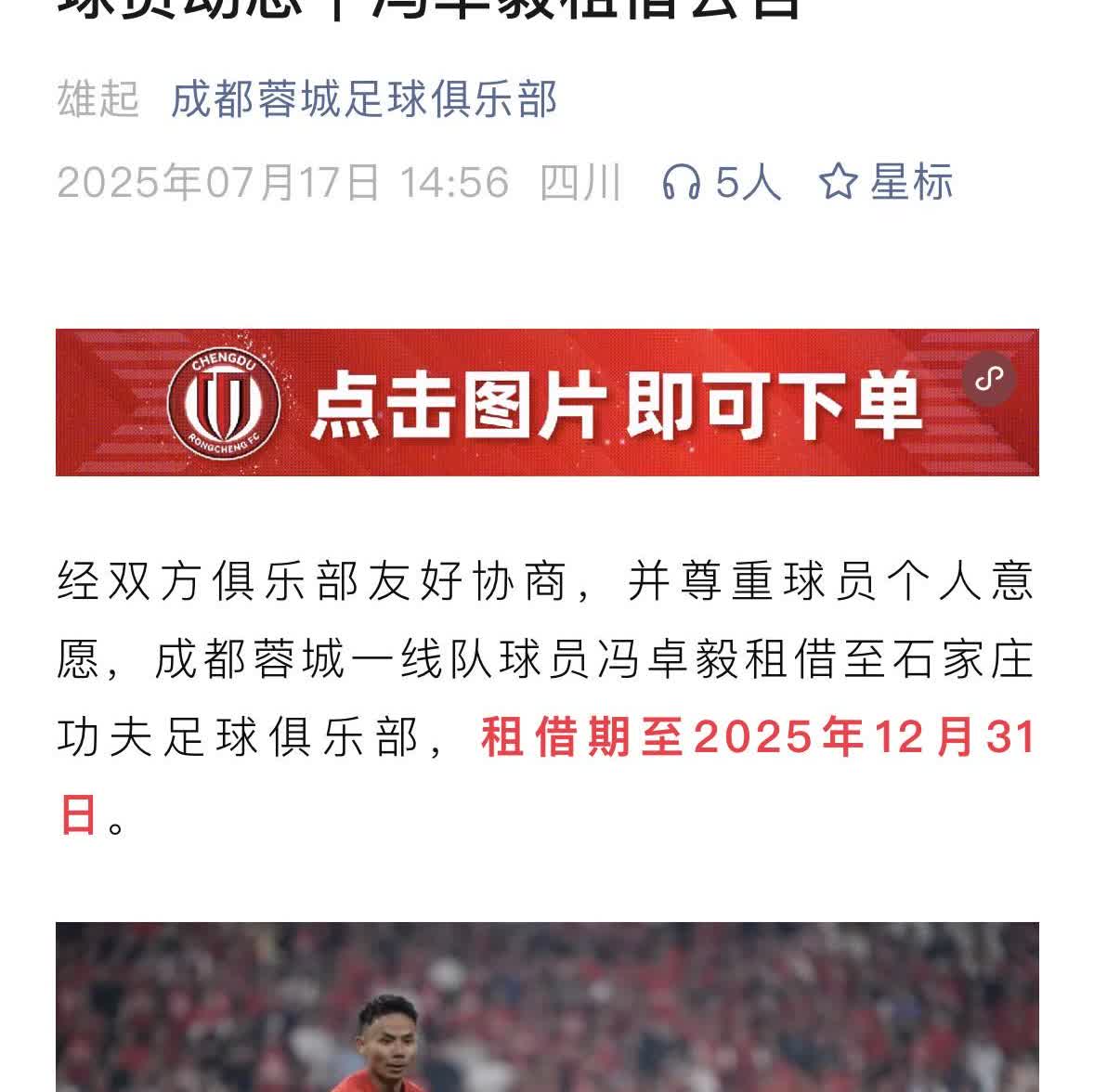 成都蓉城:一线队员冯卓越毅租借石家庄功夫!球迷:应租尽租? 啥子情况?成都