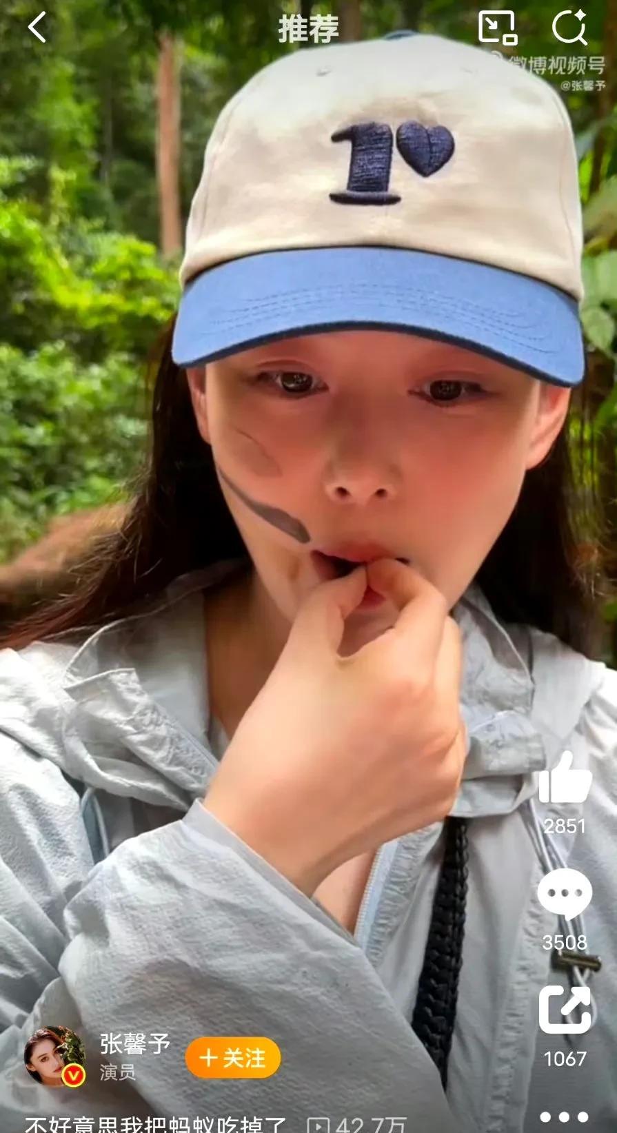 “酸的”,张馨予去西双版纳旅游,不但徒手抓毛毛虫,而且还生吃蚂蚁,事后还回复网友