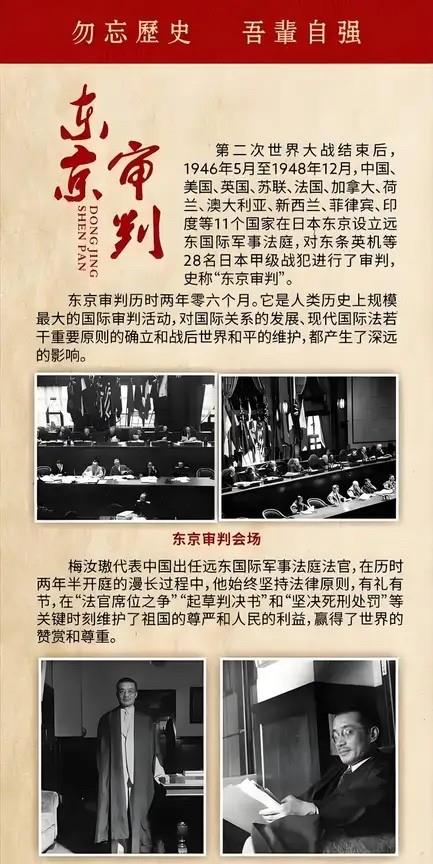 在积贫积弱的旧中国,是梅汝璈挺起了中国的脊梁,历史永远不会忘记在中华危难时刻挺身而出的中华好儿郎。永远铭记那段血泪史,仅凭东京大审判中梅公的为国执言,梅公也值后人敬仰感激。