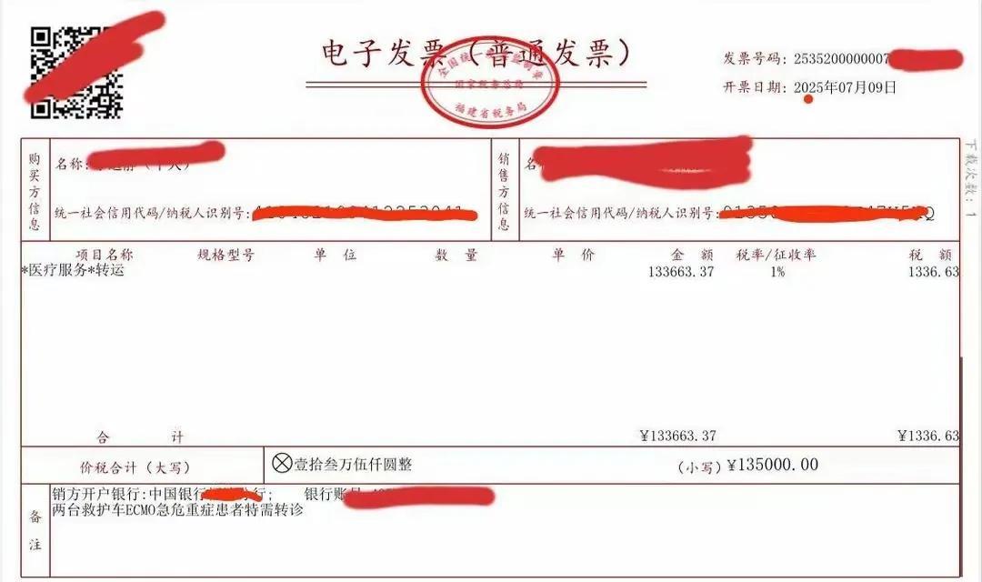 对比最新13.5万的携带ecmo转运费, 媒体报道了一起合规的跨省救护车转运案例