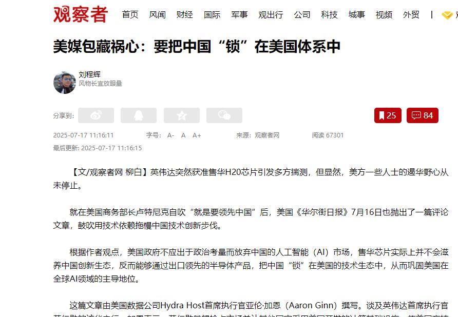 美国松口让英伟达卖 H20 芯片给中国,哪是什么善意?分明是包藏着更阴的算计——想用几块芯片当锁链,把中国的技术发展牢牢捆在美国的生态里。商务部长卢特尼克喊着 “要领先中国”,转头就批准芯片对华销售,说白了就是既想赚中国市场的钱,又想通过技术捆绑卡住咱们的脖子。 这种左手递糖、右手握刀的把戏,早就藏不住背后的野心了。 美国对卖给中国芯片这事儿,心里一直挺纠结的。 商务部长卢特尼克一边说 “得比中国强”,一边又松口让 H20 芯片重新对华销售,还说 “得让中国接着买美国半导体”。 说白了,就是又想卡我们脖子,又舍不得丢了中国这个大市场。 拜登这几年,美国芯片在华的份额掉了不少;反倒是特朗普那会儿,吵归吵,生意该做还做。 可他们没料到,这种反反复复,正好给了中国企业机会。 国内公司早就做好了两手打算,一边用着英伟达的芯片干活,一边偷偷搞自己的研发。 像昇腾、寒武纪这些国产芯片,不少场景都能用了。 有大厂技术负责人就说,就算 H20 随便买,咱们自己的替代计划也不会停,谁愿意一直被别人牵着走啊。 其实这道理特简单,技术这东西,越被盯着防,越容易被逼出能耐来。 以前咱们在芯片软件、高端制造上确实差点意思,但这两年进步真挺明显。 龙芯新处理器能跟英特尔老款比一比,国产 AI 框架也支持越来越多模型,连小科技公司都开始用国产集群训练大模型了。这些都不是吹的,是真金白银砸出来的。 英伟达自己也清楚,离了中国市场真不行。 今年 4 月不让卖 H20,一下子堆了几十亿的货,股价跌得厉害。 黄仁勋跑到中国来,说是谈合作,其实就是想稳住这块市场。 全球最大的 AI 市场在这儿呢,少了中国客户,他们那套软件生态再厉害,用的人也得少一大半。 《华尔街日报》还说,卖芯片能把中国 “锁” 在美国的技术圈里,就像卖游戏机的,机器好卖,但真正值钱的是游戏平台。 可他们忘了,中国企业买硬件的时候,早就盯着软件这块了。 现在国内搞开发的越来越多,自己的工具、平台慢慢起来了,真以为卖几台机器就能拴住人?恐怕没那么容易。 说到底,美国这些心思,就是想保住技术上的老大地位。 但他们搞错了,中国发展从来不是靠别人施舍。 从 “两弹一星” 到北斗导航,哪样不是被卡着脖子搞出来的? 现在芯片领域也一样,越想困住我们,我们越要自己闯出条路来。 黄仁勋说限制会让中国技术更独立,这话没说错,就是美国有些人不愿意承认。 真想保持领先,得靠不断创新,而不是耍小聪明搞捆绑。 中国市场一直敞开着,但想靠卖东西拿捏人,那真是打错了算盘。