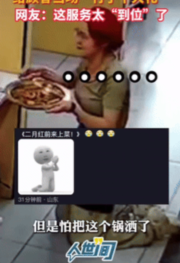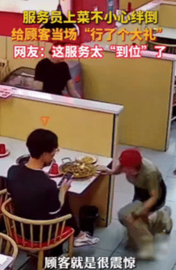 “笑岔气了!”河北一服务员给顾客上菜时,不小心被地垫绊倒,因担心把锅里的食物撒出