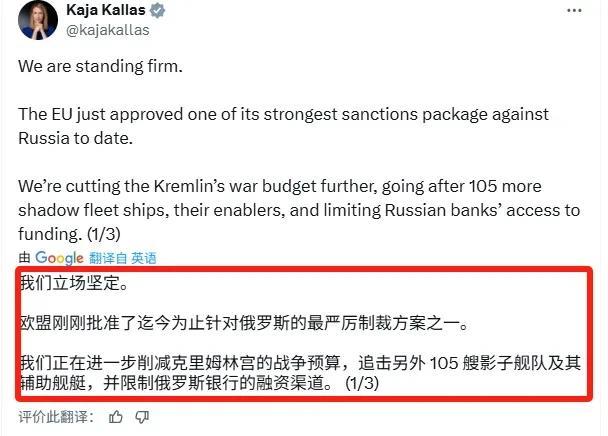 卡拉斯官宣,欧盟刚刚(7月18日)批准了迄今为止针对俄罗斯的最严厉制裁方案之一。