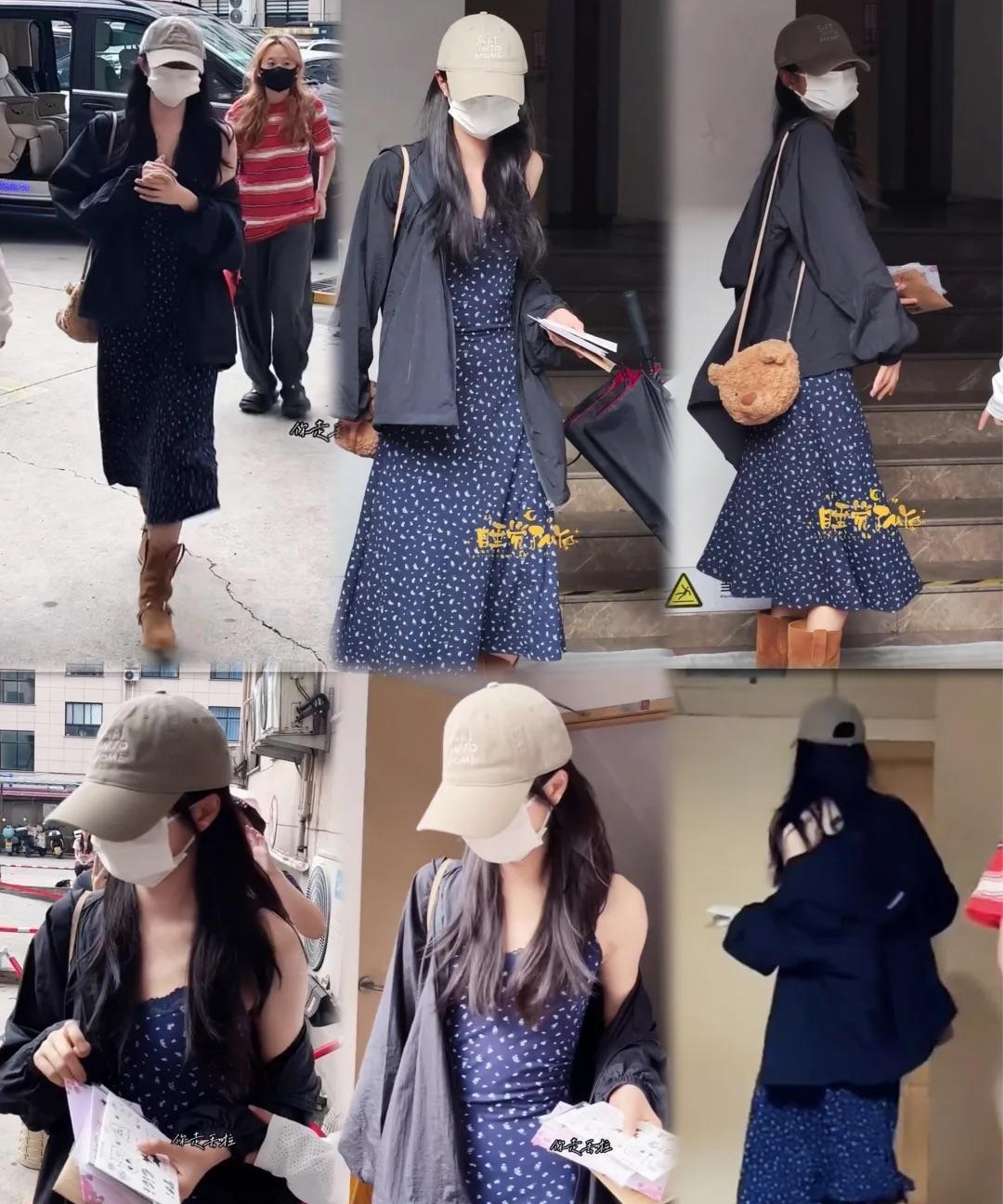 徐若晗私服分享,这一套很有偶像剧女主的氛围感! 纯欲风的蓝色碎花长裙混搭黑外套,