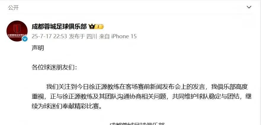 徐正源的这波操作是有些愚蠢的!这样一来这个事不会有啥好结果了! 成都蓉城主教练徐