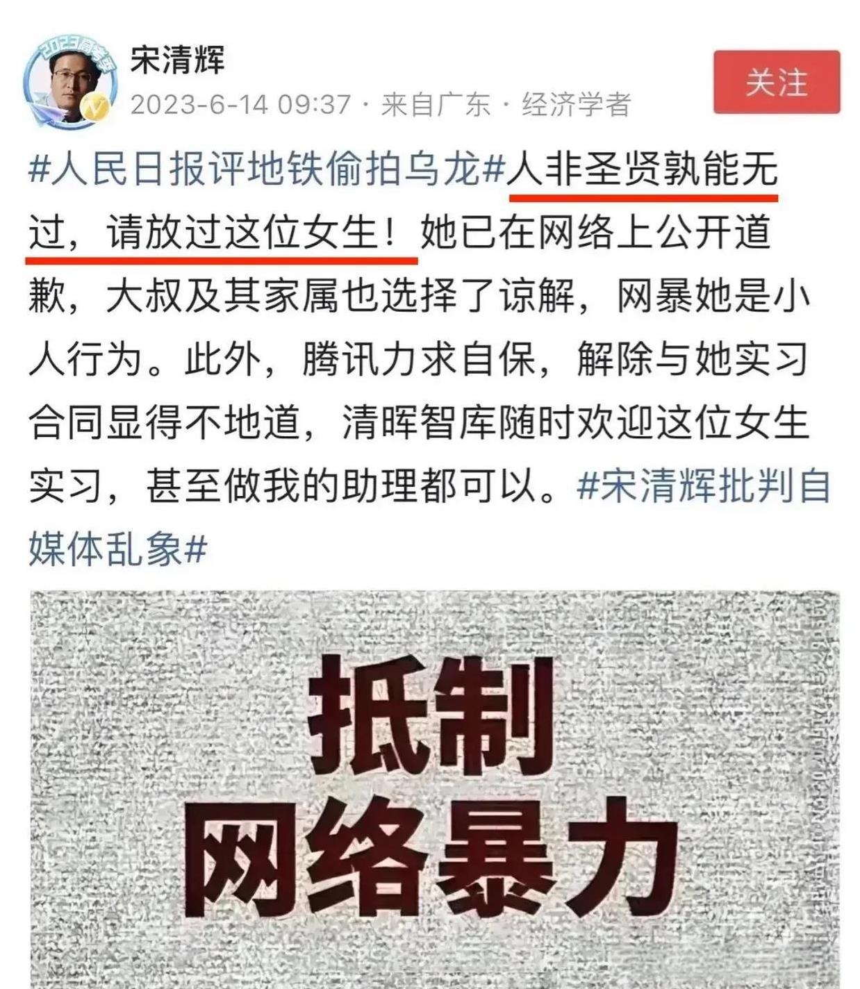 宋清辉又出来作妖了。 在网上大声疾呼大连工业大学必须向李同学道歉。 翻翻这位自封经济学家、自己给自己改百科词条的网络红人经历,那真是劣迹斑斑啊。 啥热点都蹭,就是从不站在善良和正义这一边。 面对为钱逼死老公的翟欣欣,他声称这么漂亮的女孩子被冤枉了; 面对网暴地铁大叔偷拍的女生,他公开邀请其到自己公司上班,却对受害大叔不置一词; 面对高考季,他声称“考试分数越高的孩子,创新能力越差”; 凡是群众支持的,他都反对; 就是从不站在正义和良知这一边。 语不惊人死不休,怎么无耻怎么说。 无它,就是习惯了吃血馒头。 你越骂他,他越开心,因为这样可能更火,能赚更多流量费。 真是网络之大,什么魑魅魍魉都有。