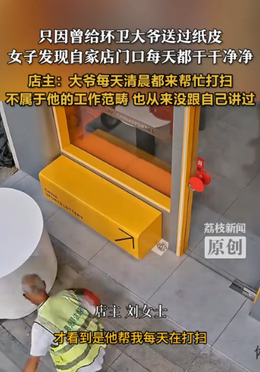 信息来源:《只因曾给环卫大爷送过纸皮女子发现自家店门口每天都干干净净店主8大爷每天清晨都来帮忙打扫不属于他的工作范畴也从来没跟自己讲过》荔枝新闻