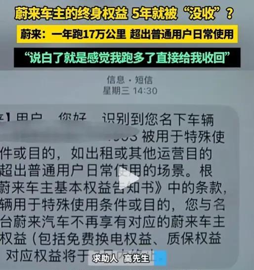 彻底解释不清了! 河南大哥花60万买的蔚来, 凭啥说收回终身权益就收回?就因为 一年跑了17万公里, 车企说“超出普通用户日常”, 怀疑他拿去营运了? 这操作也太让人窝火了吧! 大哥五年前敢砸60万买电车, 不就冲着合同里“终身质保、免费换电”的承诺吗? 前四年跑11万,日均75公里, 搁在大城市通勤很正常; 最后一年17万,算下来日均465公里, 说不定是人家爱自驾,跑了两次长途呢? 合同上没写里程限制, 现在跑多了就翻脸, 这“终身”俩字也太不值钱了。 做生意讲究一诺千金,白纸黑字签了的,哪能说改就改? 真怀疑营运,拿出证据来啊, 空口白牙的谁服? 早期车主是信任才敢买单, 企业就算规模做大了, 也不能寒了老用户的心。 换作是你,花大价钱买的承诺被说不算就不算,你能忍?来聊聊,这事儿你站谁?