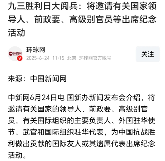 确定了!中国9.3阅兵将邀美方嘉宾参加! 据塔斯社报道,当地时间17日,中国驻美大使馆发言人刘鹏宇告诉记者,中国将邀请外国贵宾出席9.3阅兵,其中就包括“一些美方人士”。