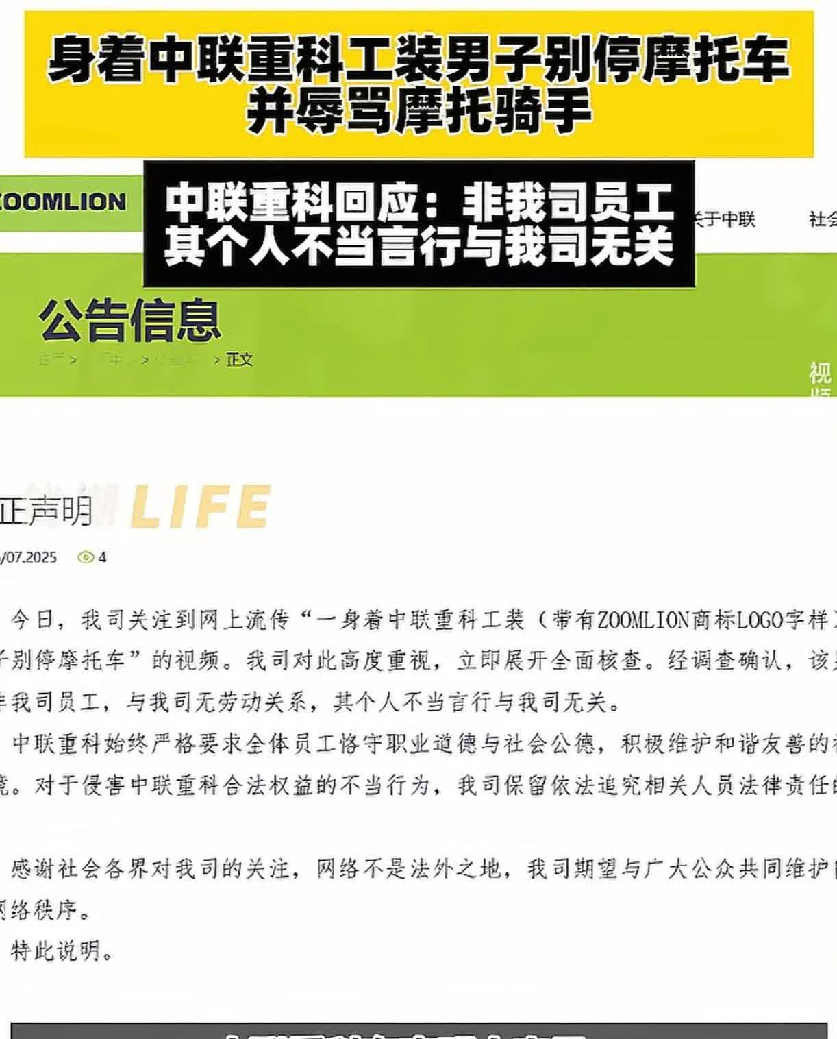 太嚣张了!山东一男子驾车连续变道,差点就把旁边的摩托车骑手撞倒了。骑手上前理论,却遭到小车车主下车叫嚣:“滚远点,我弄S你”。 从网友曝光的视频来看,明显是小车车主危险驾驶了,他一是没有提前打转向灯;二是连着变了两个车道。 摩托车骑手只是理论性说了句:引导线怎么开的,你认识引导线吗? 小车车主一听这话心里就感觉不舒服,直接把车开到摩托车前方,下车就指着骑手一顿辱骂。 视频曝光后引起网友的围观与热议! 值得注意的一点,该小车车主当时身穿“中联重科”的工服。 对此,中联重科也做出回应称:该男子并非公司员工,没有签署劳动关系的,所以该男子的不当言论和公司无关。 网友表示:如果不是该公司员工,那衣服哪里来的,别告诉我是捡的,开这么好的车不至于捡衣服来穿吧! 值得一提的是摩托车骑手的做法,即便对方犯错,他还是很有礼貌的退让,要是冲动一点的主,凭对方车主那嚣张的态度,他就吃不了兜着走了。 虽然摩托车骑手不跟对方计较,但他骑的摩托车是张雪摩托,事情发酵后,张雪机车负责人果断出手向当地帽子叔叔报了案。 当地的帽子叔叔也很给力,了解事情经过后,对小车车主做出4天拘留的处罚,大快人心。