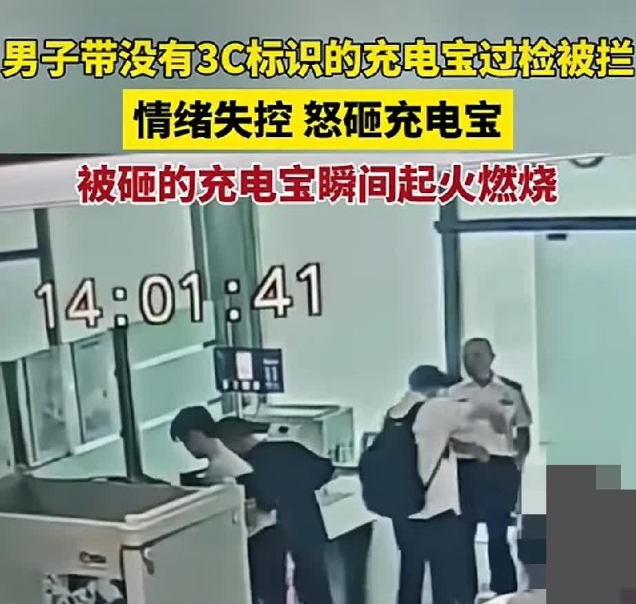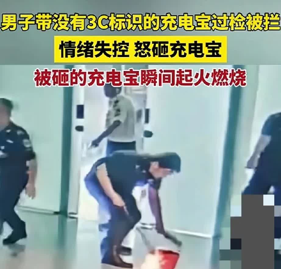 男子带没有3C标识的充电宝在机场过检被控,情绪失控怒砸充电宝。被砸的充电宝瞬间起