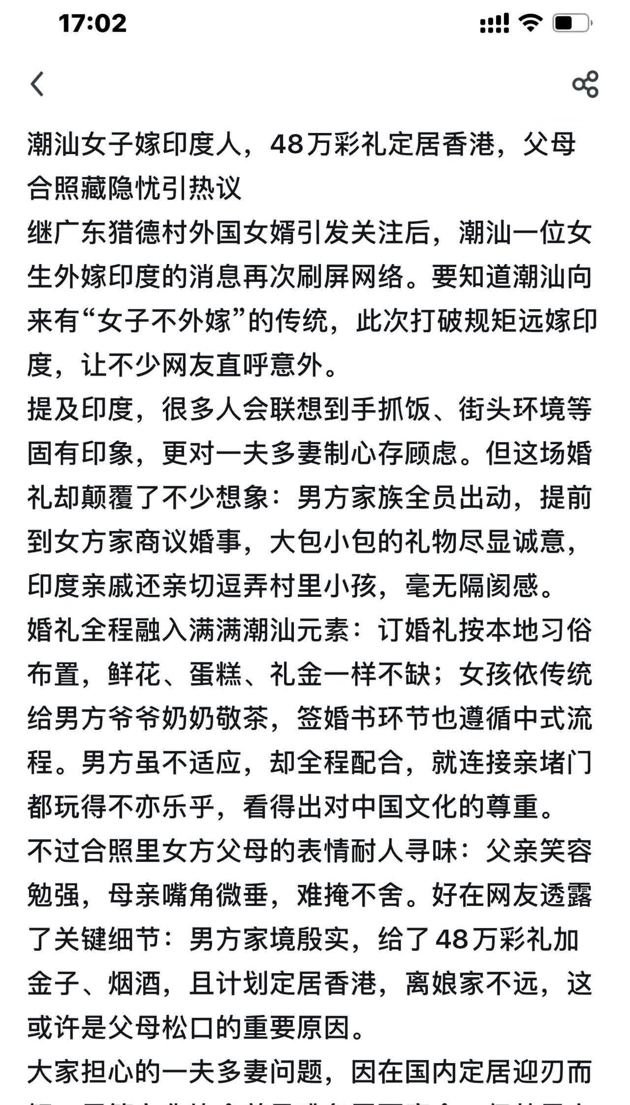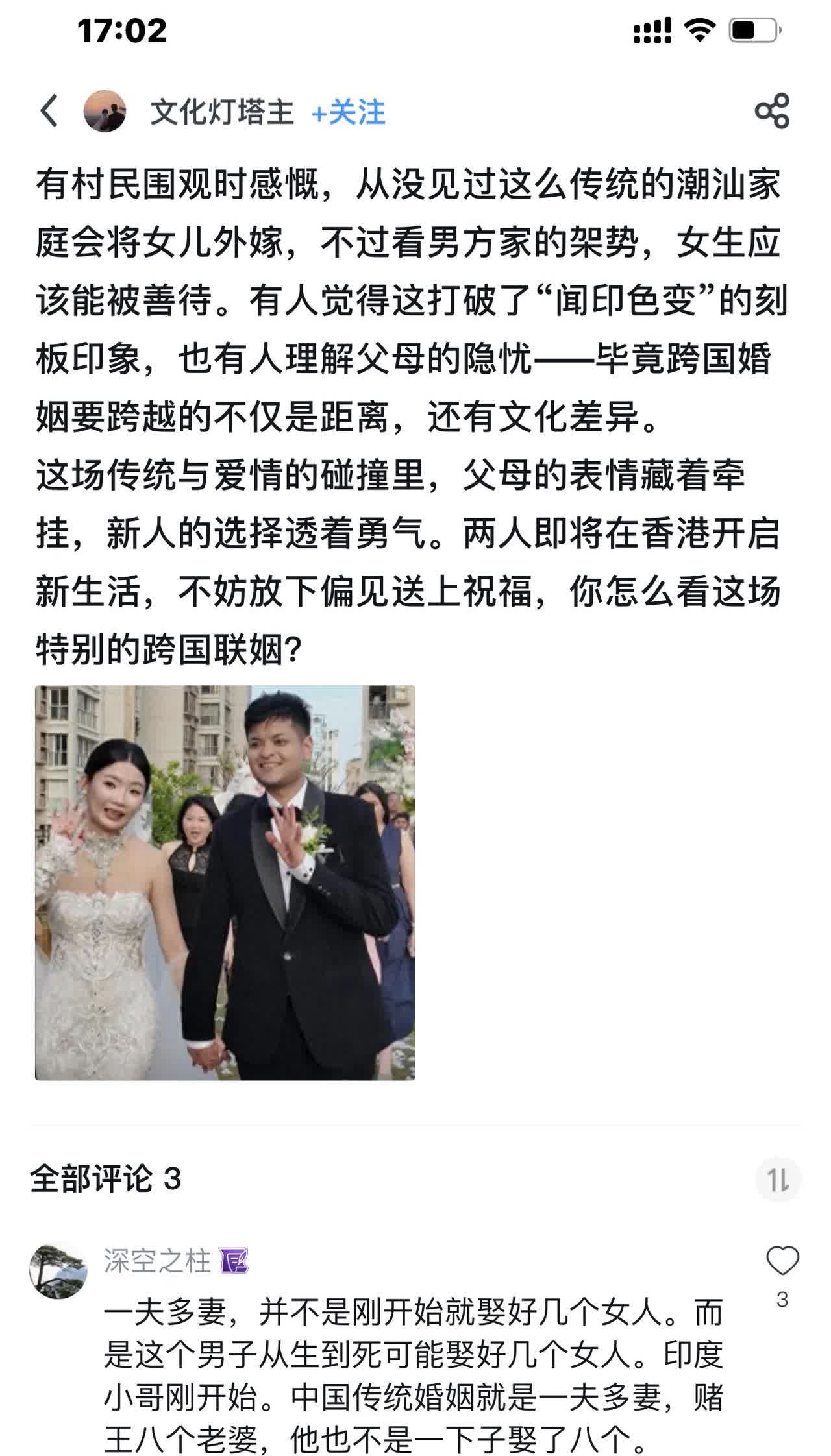 潮汕一位女生外嫁印度的消息再次刷屏网络。要知道潮汕向来有“女子不外嫁”的传统,此次打破规矩远嫁印度,让不少网友直呼意外。