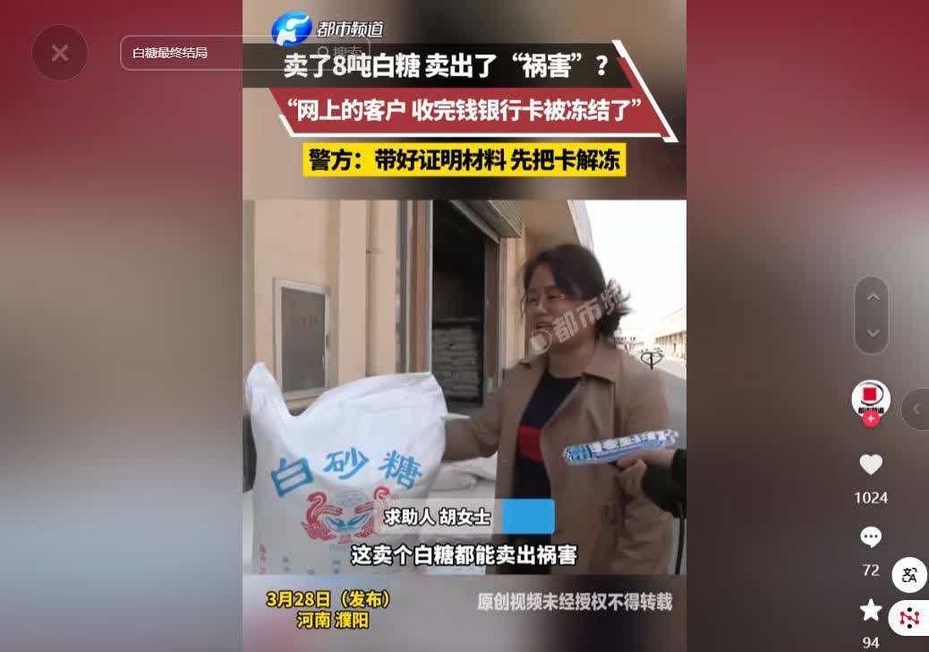 “这样下去还怎么正常做生意?”河南濮阳,一女子卖了8吨白糖,买家付钱后她便给买家发了货,共160包,每包她赚2元,女子心里美滋滋的,然而没想到的是,卖个白糖竟卖出个“祸害”,她的银行卡被冻结了! 在河南濮阳,有个卖白糖的大姐,本以为做成了一笔普通买卖,结果却摊上了大事——她的银行卡被银行给锁了。 这天,大姐在网上接到一单生意,买家的微信昵称叫“泽尼特”,一下子就要买8吨白糖,总共160包。大姐一盘算,每包能赚2块钱,心里美滋滋的。到了3月22号,买家把钱一转过来,一辆河北牌照的货车立马就来拉货了,整个过程顺畅得很。可谁成想,才过了三天,大姐就接到银行电话,说她银行卡被冻结了。这下大姐懵了,赶紧找记者帮忙,面对镜头委屈得直掉眼泪:“我就是收钱给糖,咋就犯法了呢?” 记者一看这情况,赶紧帮忙联系了福建的警察。警察一问白糖卖给谁了,大姐这才觉得事情不对劲。敢情这看似平平常常的买卖背后,可能藏着洗钱啥的违法勾当。货车司机也说,他是在网上接的这单活儿,想再联系买家,手机直接跳出风险警告,根本没法联系上。还好警察查了查,发现那女子是正经做生意的,没有故意捣乱,就让她带着买东西的单据去银行,把被冻住的钱给解了。事情是解决了,但她心里还是挺害怕的。好多网友都在说,希望相关部门能把规矩弄得更好些,别让老实本分做生意的人因为“莫名其妙被扯进案子”而心惊胆战了。