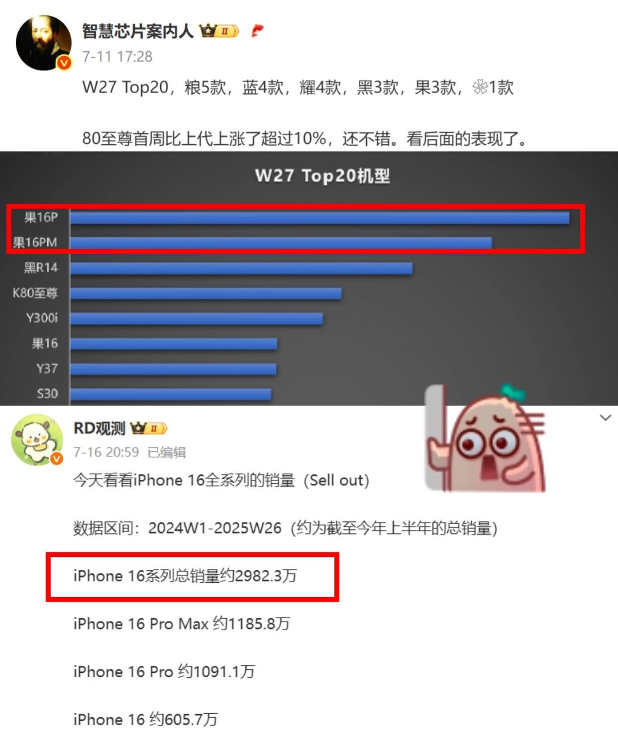 ber!都说经济下行,合着就我经济不行啊... 看博主放的榜单,iPhone 16系列今年上半年就卖了2982.3w台,里面7、8k的16 Pro/Pro Max还是卖得多得多,经常上各种榜单,比很多国产千元机都卖得好,大几千的旗舰手机你们是说买就买啊?原来只有我经济下行说是...... 反正我现在换手机是不会选大几千的旗舰了,安卓机现在又不卡了,中端机就很够用了,用几年不是问题,没必要花那么多非要买苹果嘛 而且国产机都很卷,前两年还有看到那种带风扇的电竞手机,直接心动住,可惜当时还是太贵没舍得下手,现在看到OPPO要出款中端机OPPO K13 Turbo系列就有带风扇的,价格好像是2000左右的,主打性能的,到时候发布后去线下看看合不合适 买手机还是理性点啊,考虑好性价比,多去店里摸摸看适不适合自己才好