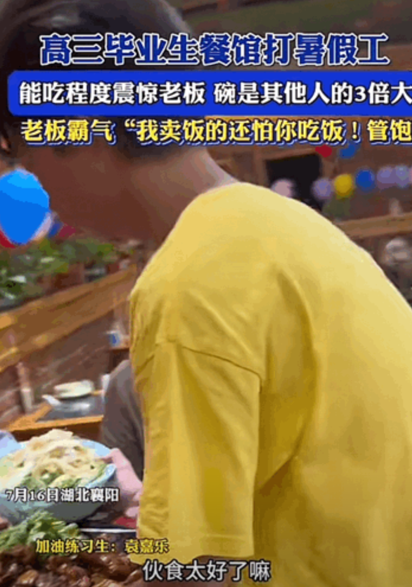 这老板格局大!湖北,高三毕业生餐馆打暑期工,小伙子饭量特别大,碗是其他人的三倍大,能吃程度震惊老板。可老板并不吝啬,霸气说道:“我卖饭的还怕你吃饭!”管饱管饱!网友:半大小子吃穷“老板”!