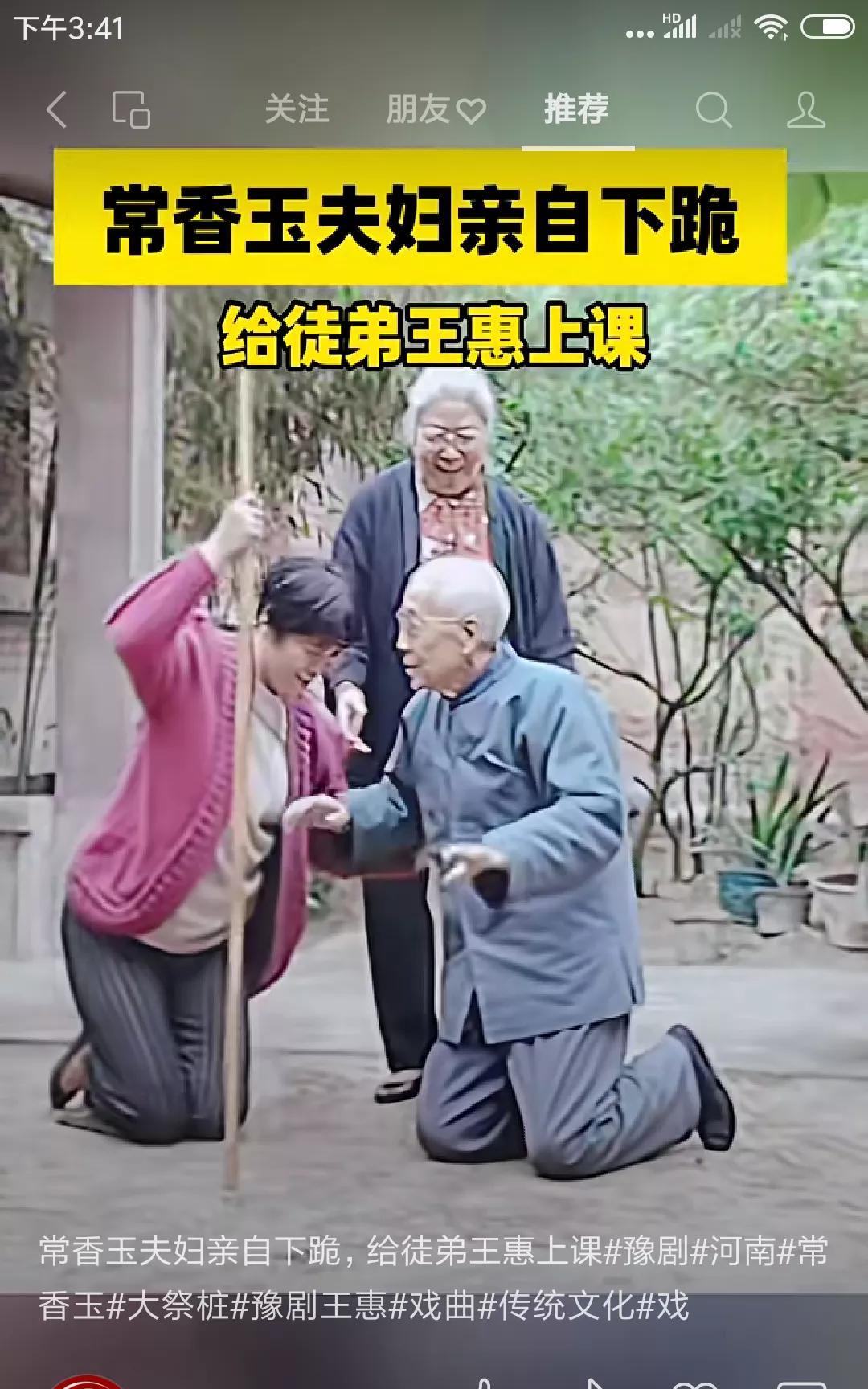 刷抖音看到感人一幕。 豫剧大师常香玉夫妇,年迈时,还亲力亲为,教爱徒学戏。 下跪
