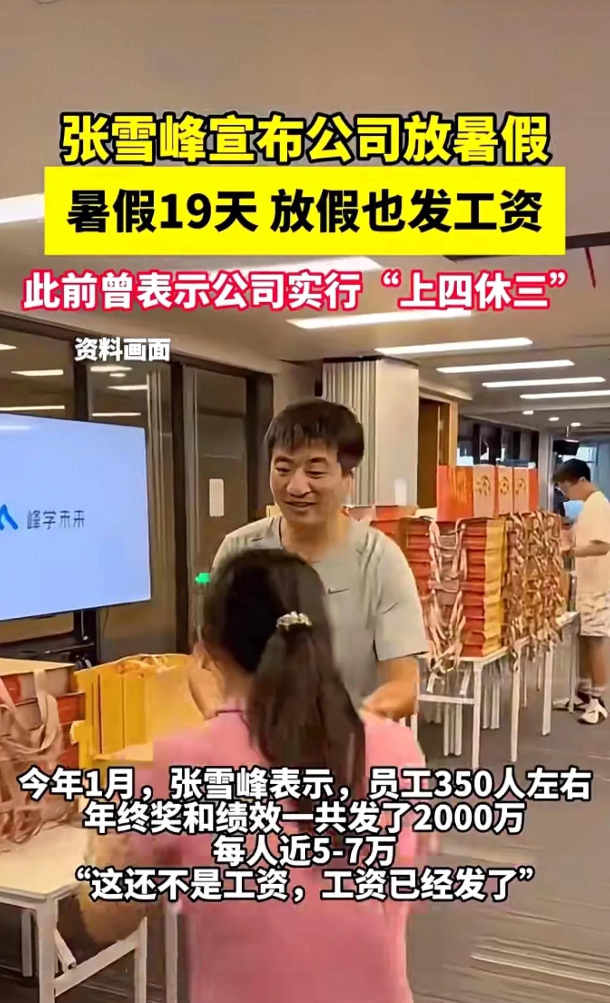张雪峰又给员工放暑假了!今年暑假为期19天,从7月16日放到8月3日,而且在今年的一月份,张雪峰为公司350人发放了2000万的年终奖,每人平均5-7万元。有网友表示,神仙公司都是别人的。 从2023年开始,张雪峰公司就实行了上四休三的工作制,而且每年暑假都会给员工放暑假。各位网友也要放平心态,毕竟公司性质不一样,他们暑假的时候反正也没事,在公司待着还浪费电,不如直接放假划算。 有网友表示,AI填报志愿已成雏形,从明年开始,张雪峰的公司也就不再重要了。其实吧,这个AI填报志愿到底如何,目前还不得知。即便是张雪峰的公司因此垮掉,那对他来说也无所谓了,毕竟这些年已经赚的盆满钵满了,几辈子都花不完了。