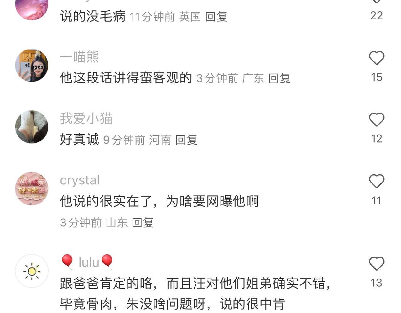 搞不懂s家的粉丝们干嘛去网暴朱孝天啊!他只是个直性子的人讲了几句实话而已!现在的人啊,已经听不得别人讲实话了。一言不合就群起攻之…… 看了朱孝天在评论区的回复,必须给他的同理心点一个赞!他的共情能力值得当下人情淡薄的人学习…… 朱孝天的出发点是站在大s的角度去理解:大s为什么临终的时候愿意放下一切把两个孩子交到汪小菲手里!因为她知道,汪小菲是一心一意爱孩子的! 他能共情到孩子回到父亲身边是对两个孩子最好的安排! 不然难道让具俊晔来养?!不可能的事啊!大s至死都是清醒的知道最爱孩子的是汪小菲……