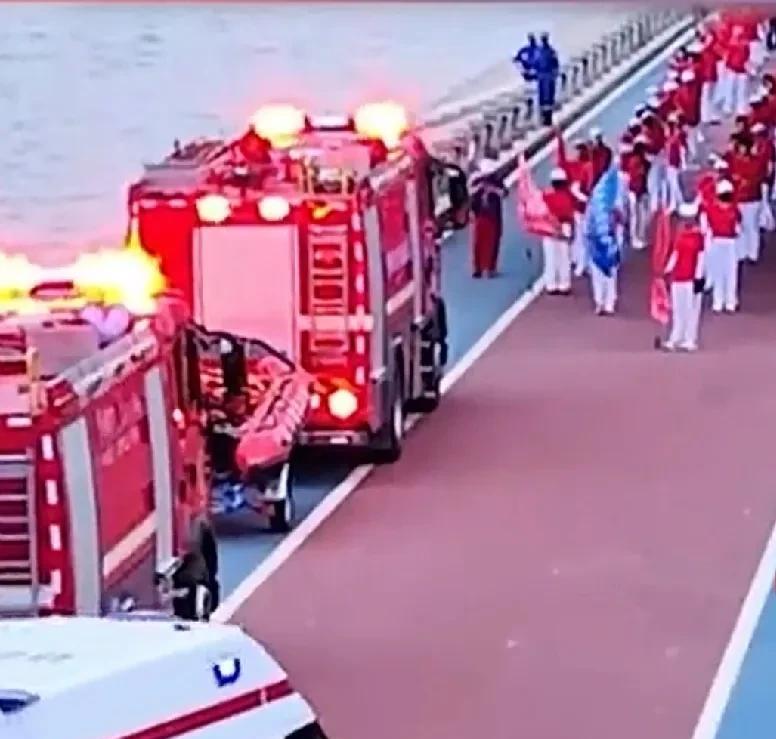 辽宁省朝阳市,2025年7月17日。 两辆消防车和一辆救护车,遇到了老年“暴走团