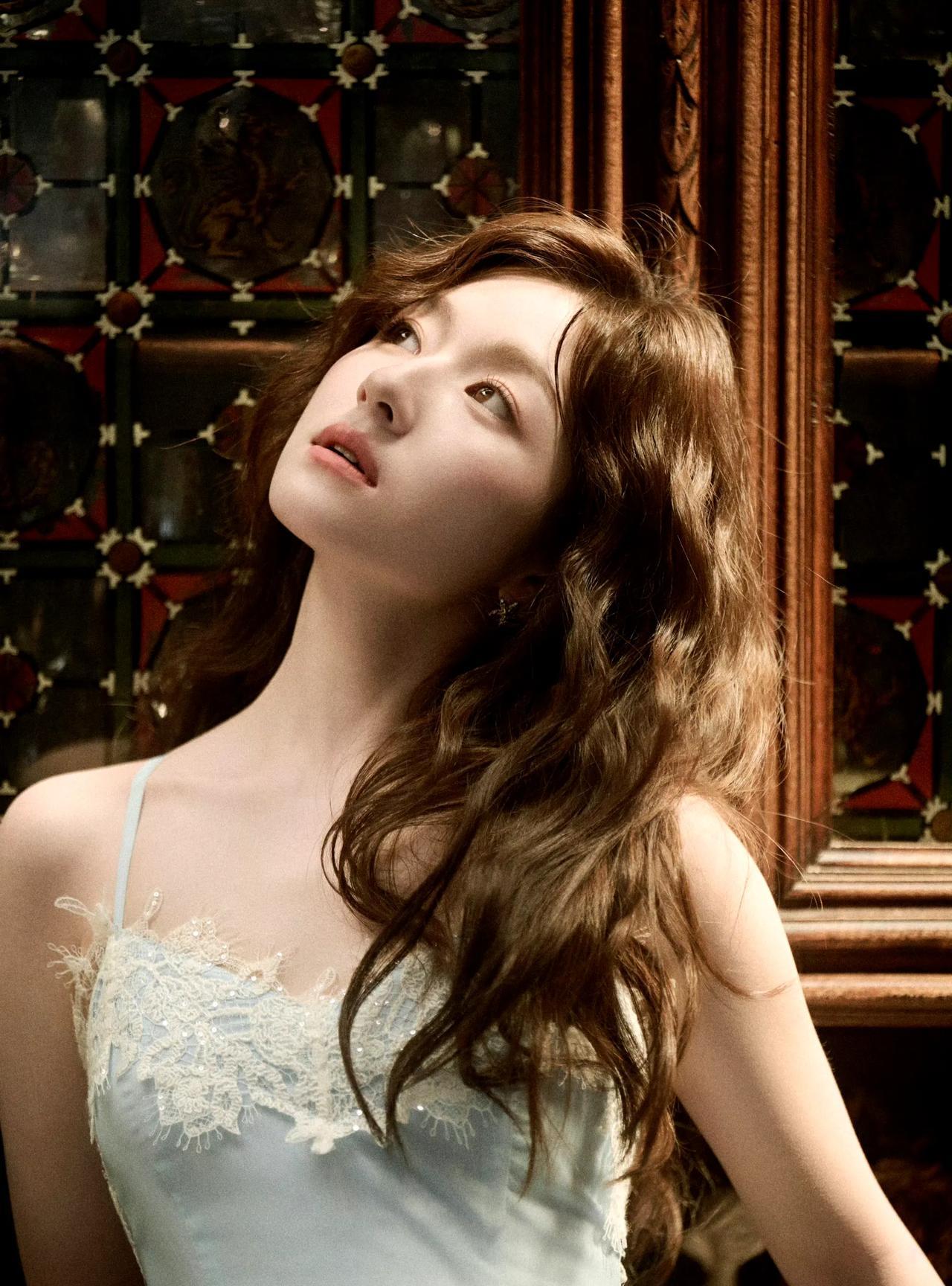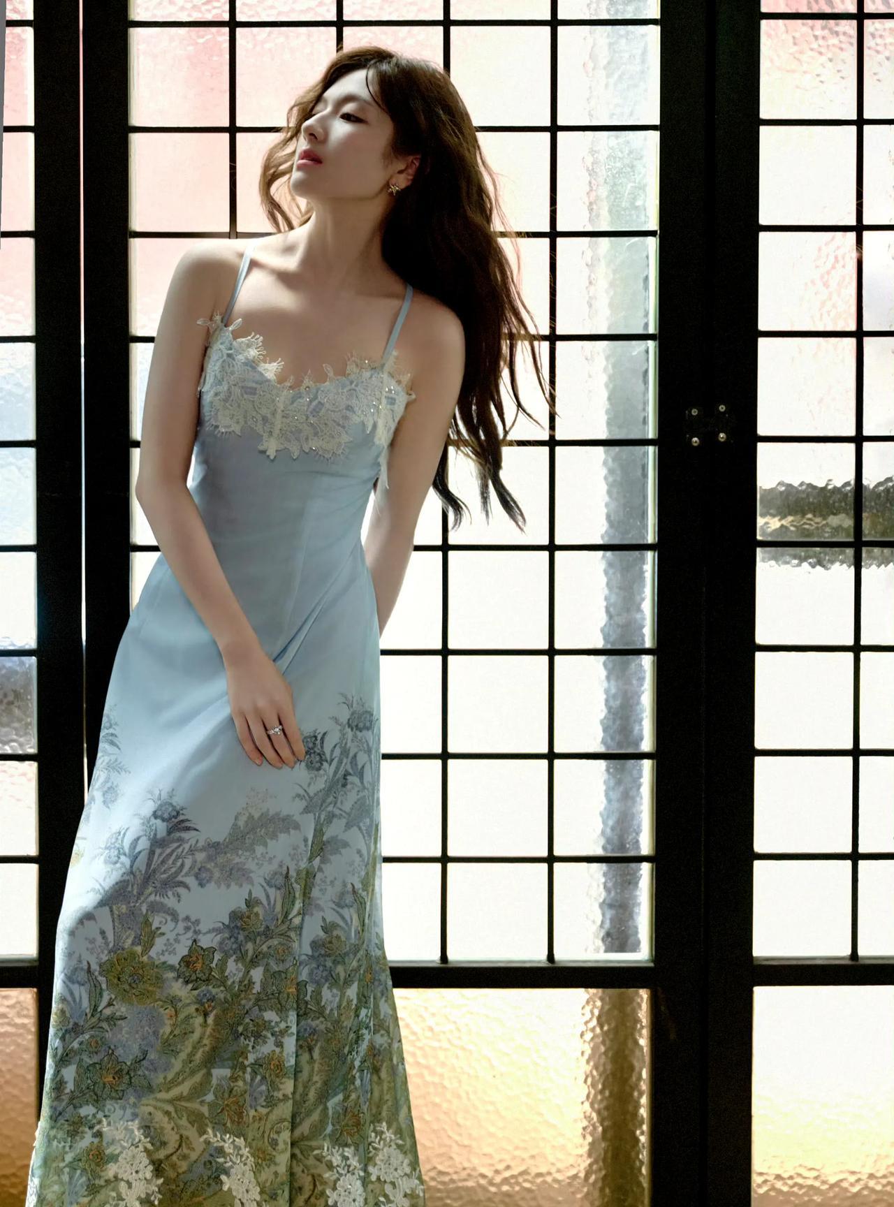#李兰迪#淡蓝色吊带裙轻裹身躯,蕾丝花边晕开温柔,复古花窗为背景,氛围感拉满,定格优雅瞬间。李兰迪#