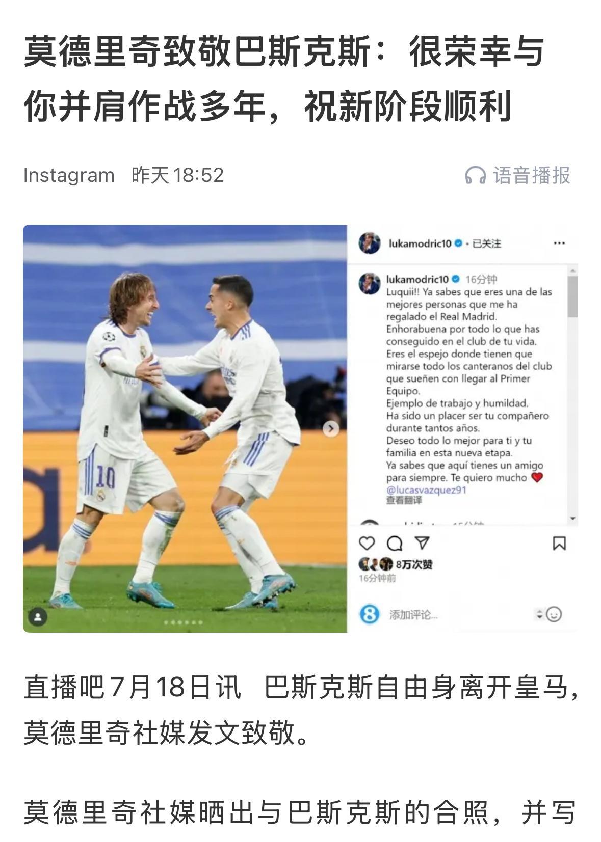 这样的巴斯克斯,谁能不爱! 对于这样的巴斯克斯,莫德里奇更是有着切身利益的感受。 当莫德里奇在皇马的大巴上哭得伤心的时候,坐在身旁的巴斯克斯看到了这一切。 这个时候的巴斯克斯,没有劝慰,只有切身的安慰,他将莫德里奇揽入怀中,抚慰着莫德里奇的心灵。 #莫德里奇# #巴斯克斯#