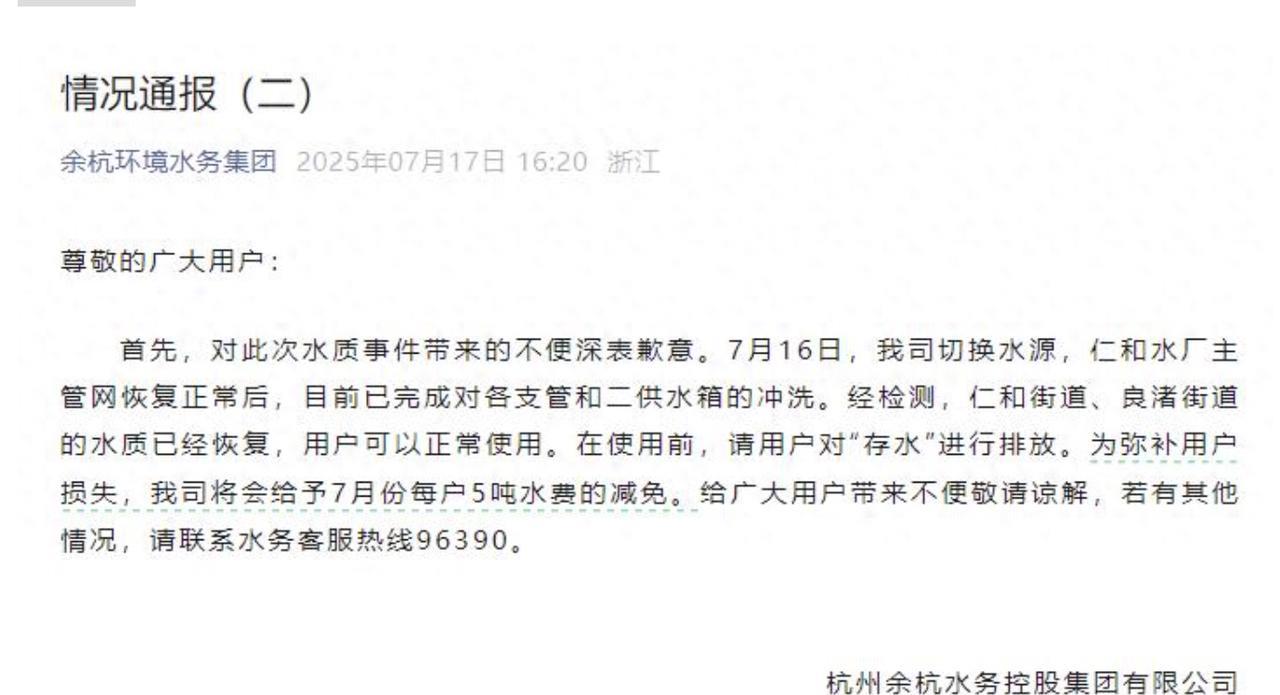 杭州多小区自来水出现异味事件,当地的水务公司辟谣了! 说不是粪水管接错导致污水,这个水只是闻起来味道大,事实上水质整体是清澈干净的。此外,他们更是很大方的表示,会给予7月份每户5吨水费的减免。而与此同时呢?当地的一些网友也表示,他们现在的水也慢慢恢复了正常。到了这,这起事件似乎也应该到此结束了,可真的就解决了吗?我看未必!因为还有三个关键问题没解决。 第一,导致这次污水事件的原因是什么?既然不是网传的粪水,那么这些带有异味的水,又是从哪来的?这不能就稀里糊涂的过去,而应该知道原因后,避免类似的事情发生。可到目前为止,当地表示因为牵连甚广,所以仍旧在调查中,而具体的原因仍未可知。而自来水与公众利益切身相关,所以有权利知道背后的真相! 第二,只是减免5吨水的补偿是否过轻?按照水价来计算的话,也就15块钱左右。可问题是居民的损失何止15块?你去外边随便买一箱矿泉水,都要几十块钱吧。而且这些水要是流进了一些家电里边,是否也会加剧这些家电的老化,这是不是也是损失?再者,如果有居民不留神,真的饮用了这些水,他们的身体健康是否也会受到损害,这是不是也是损失?所以只是减免5吨水,多少有点让人无法接受。 第三,周边的食品厂水质是否也受到影响?据网友透露出现污水时,周边的一些食品厂没有停工。那这些食品厂所用的水源,是否跟居民所用的是同一个水源。如果不是的话倒好,如果是的话,请问这期间生产出来的食品,是否也受到了影响?那大家还敢买这些食品吗?当地有义务做出回应,并解决大众的疑惑!