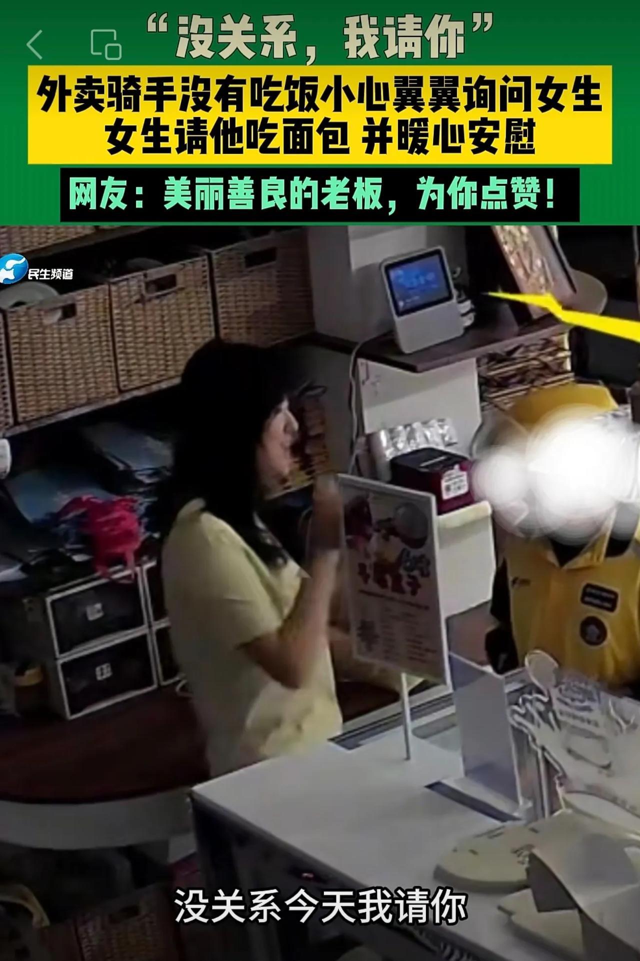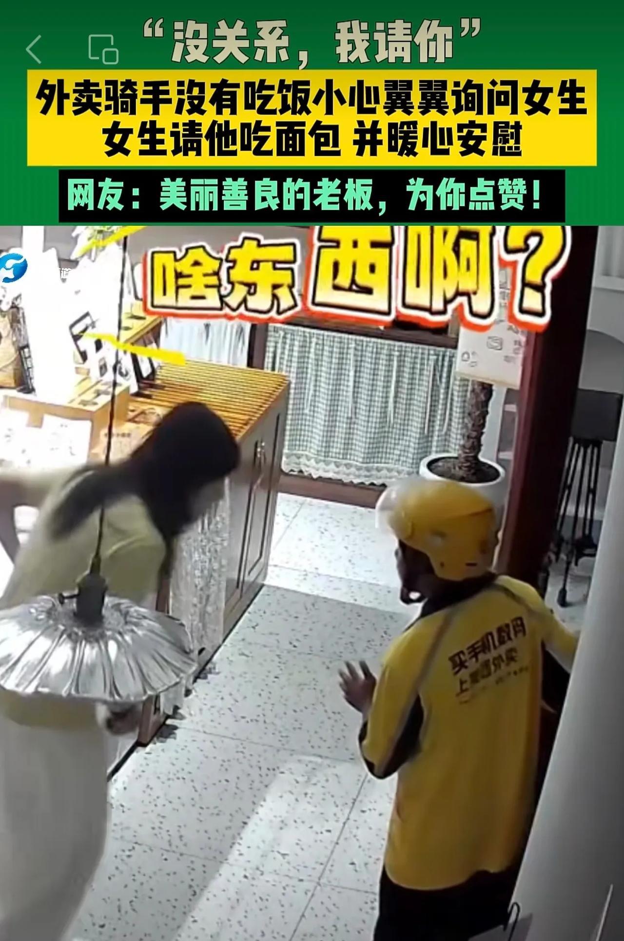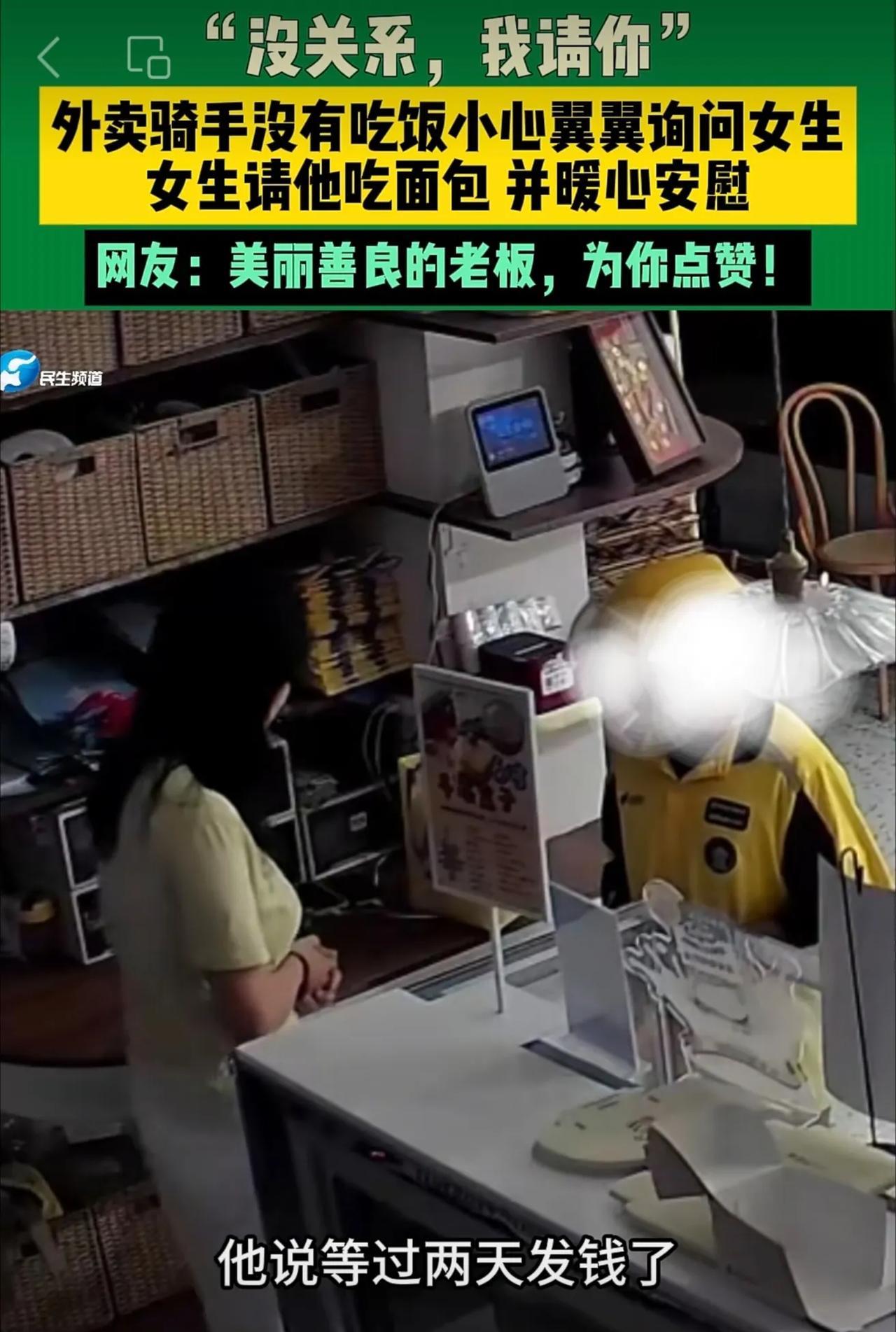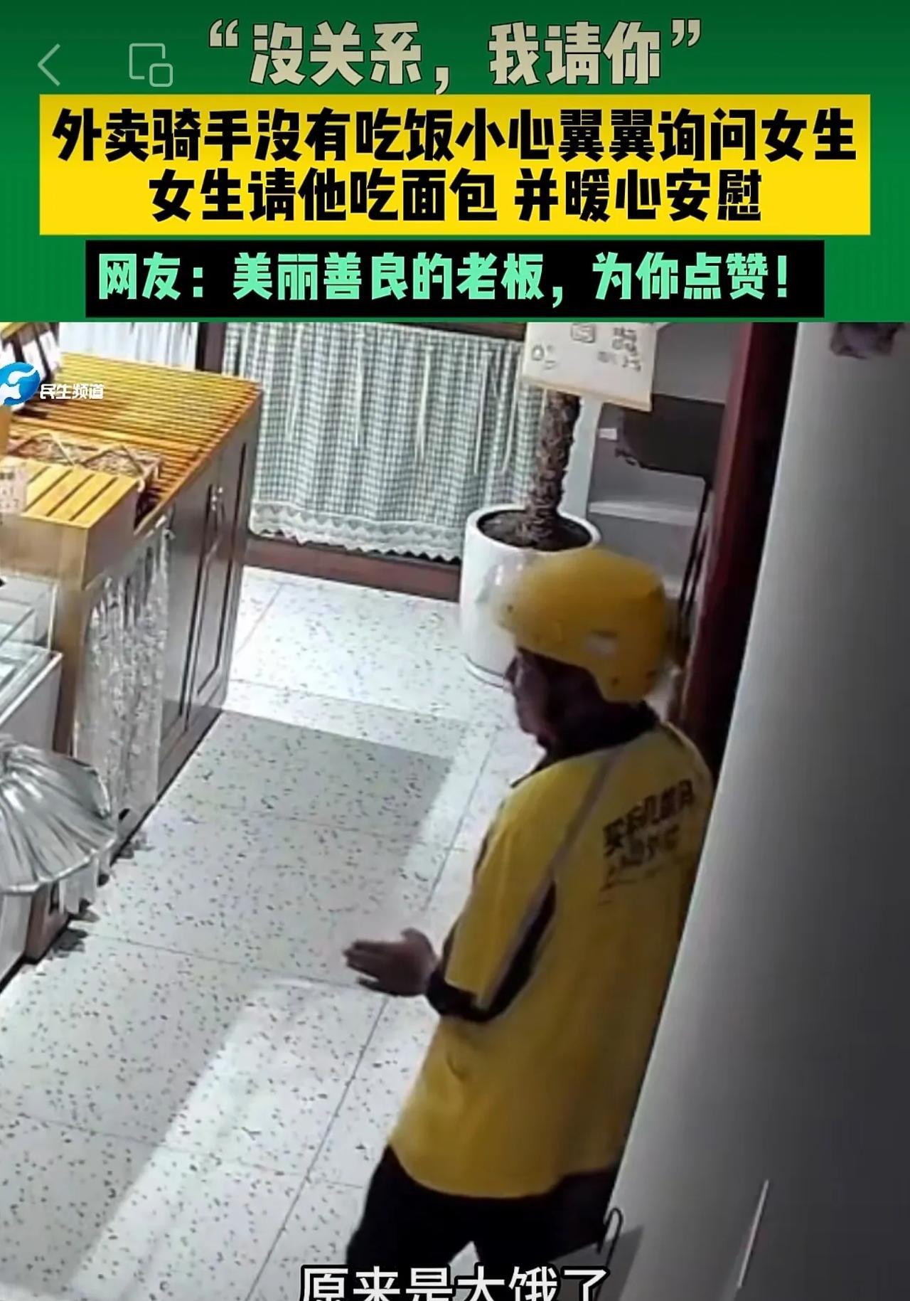 7月18日(发布),“没关系,我请你”外卖骑手没有吃饭小心翼翼询问女生,女生请他吃面包 并暖心安慰。