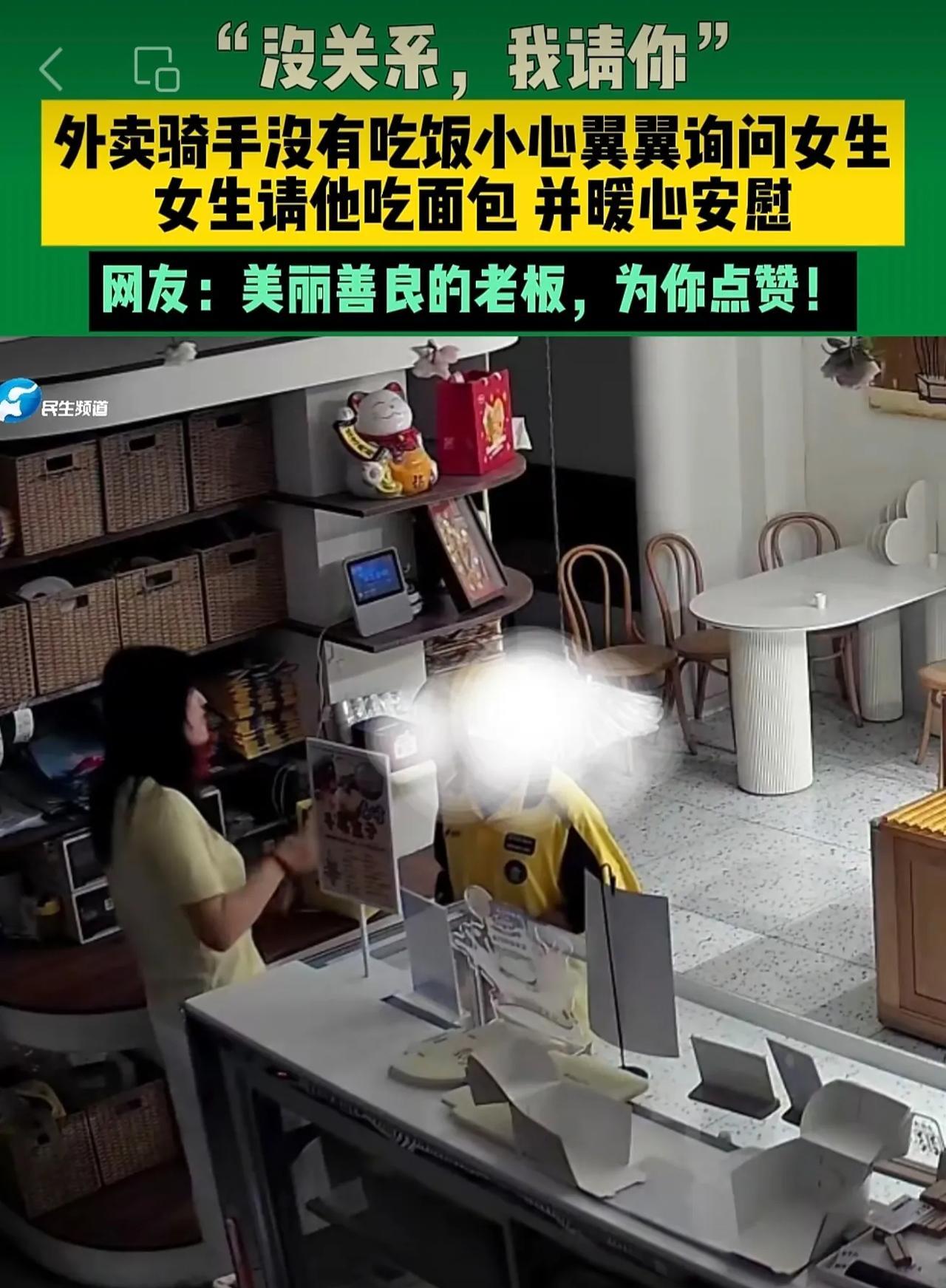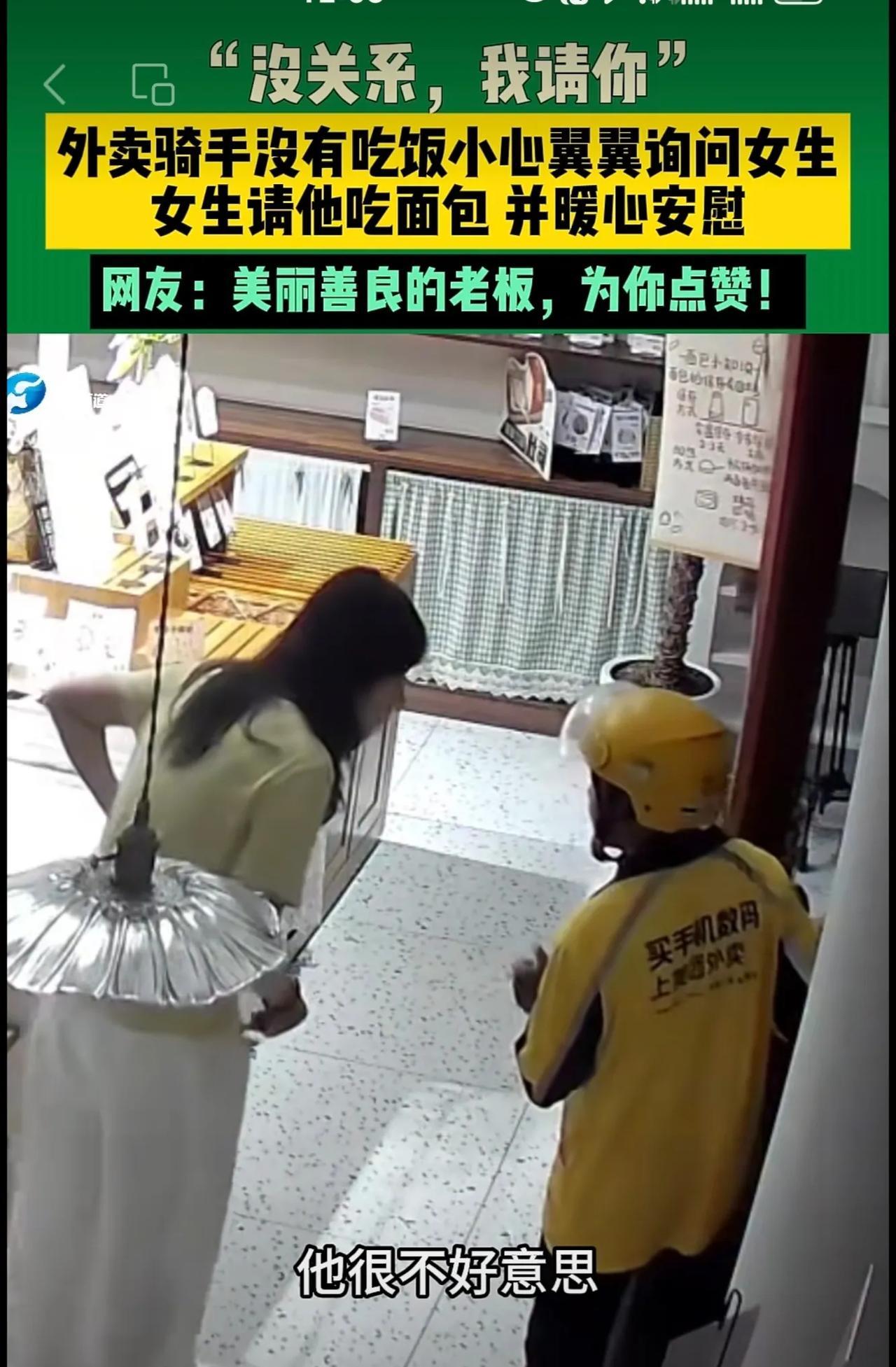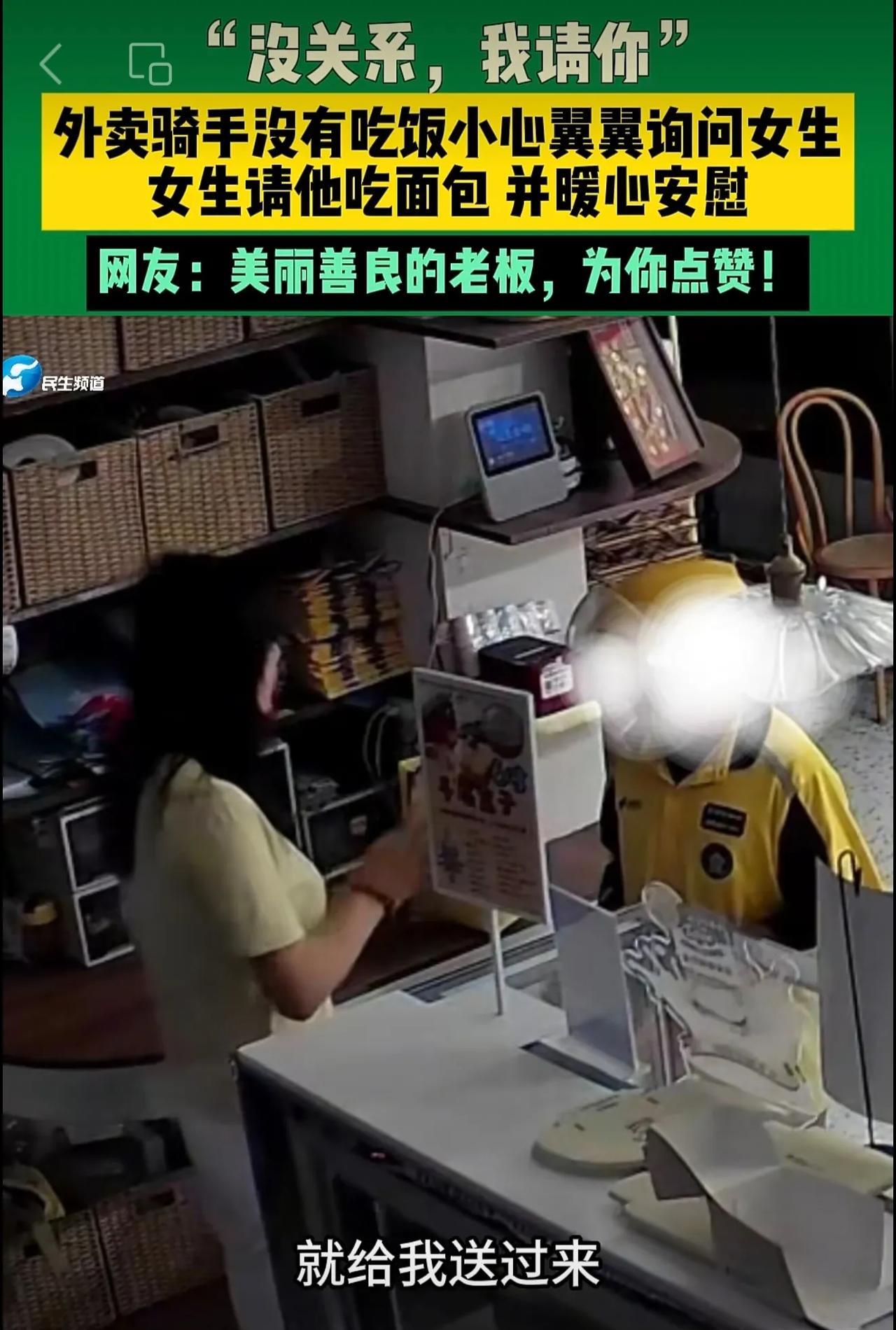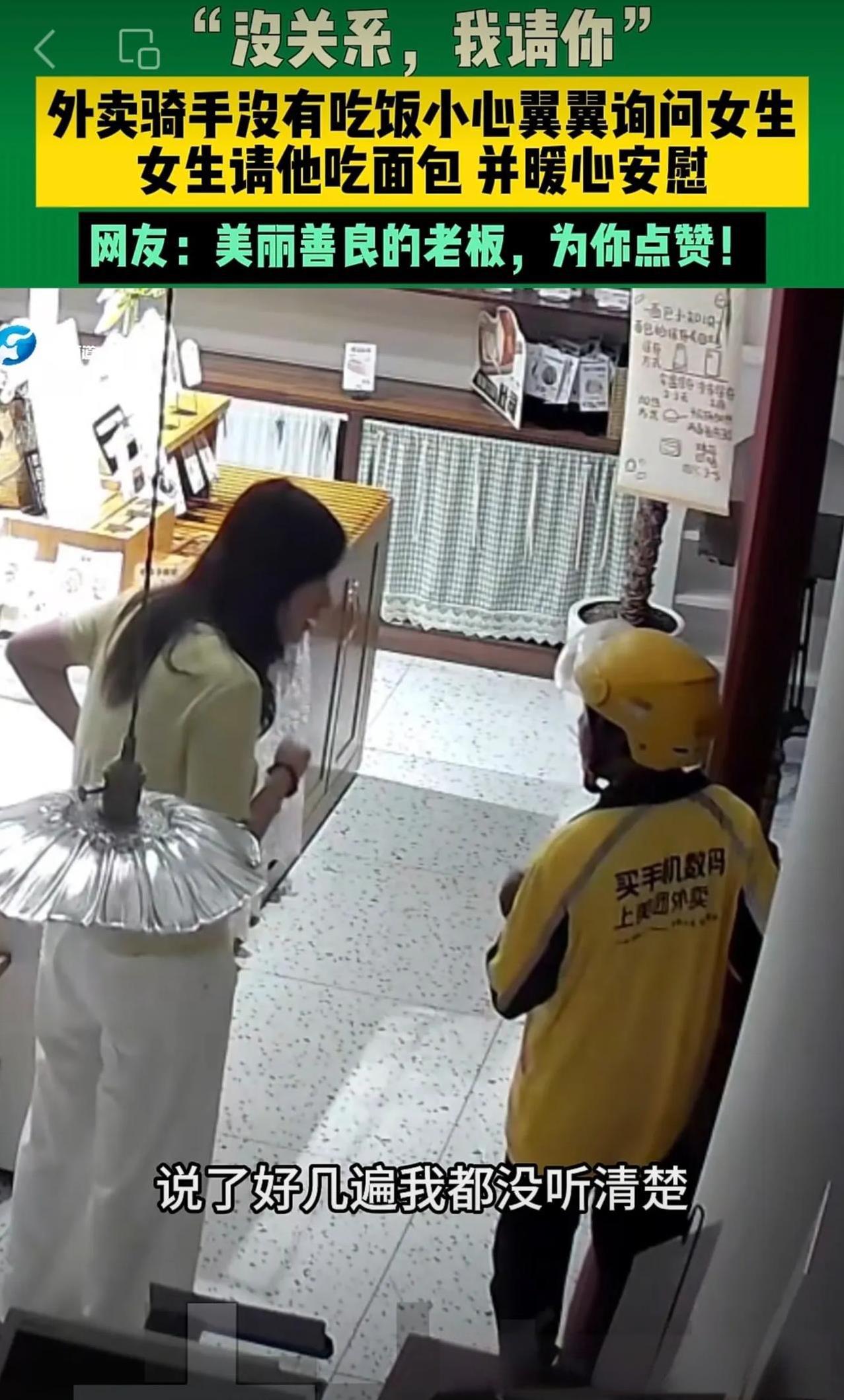 7月18日(发布),“没关系,我请你”外卖骑手没有吃饭小心翼翼询问女生,女生请他吃面包 并暖心安慰。
