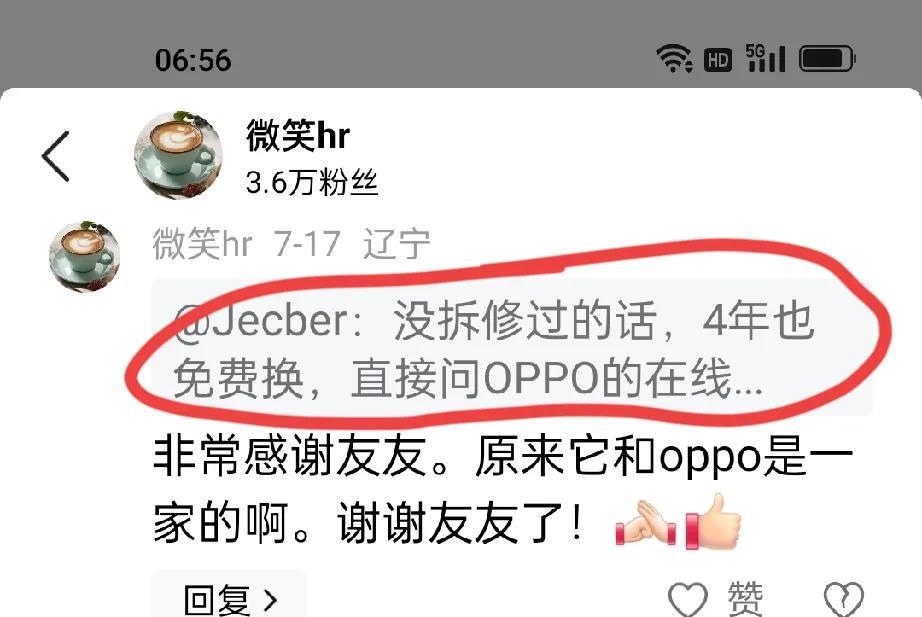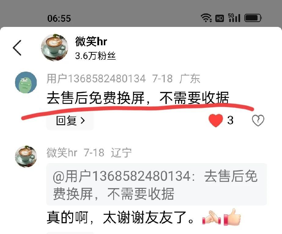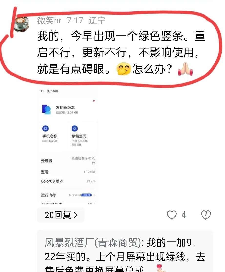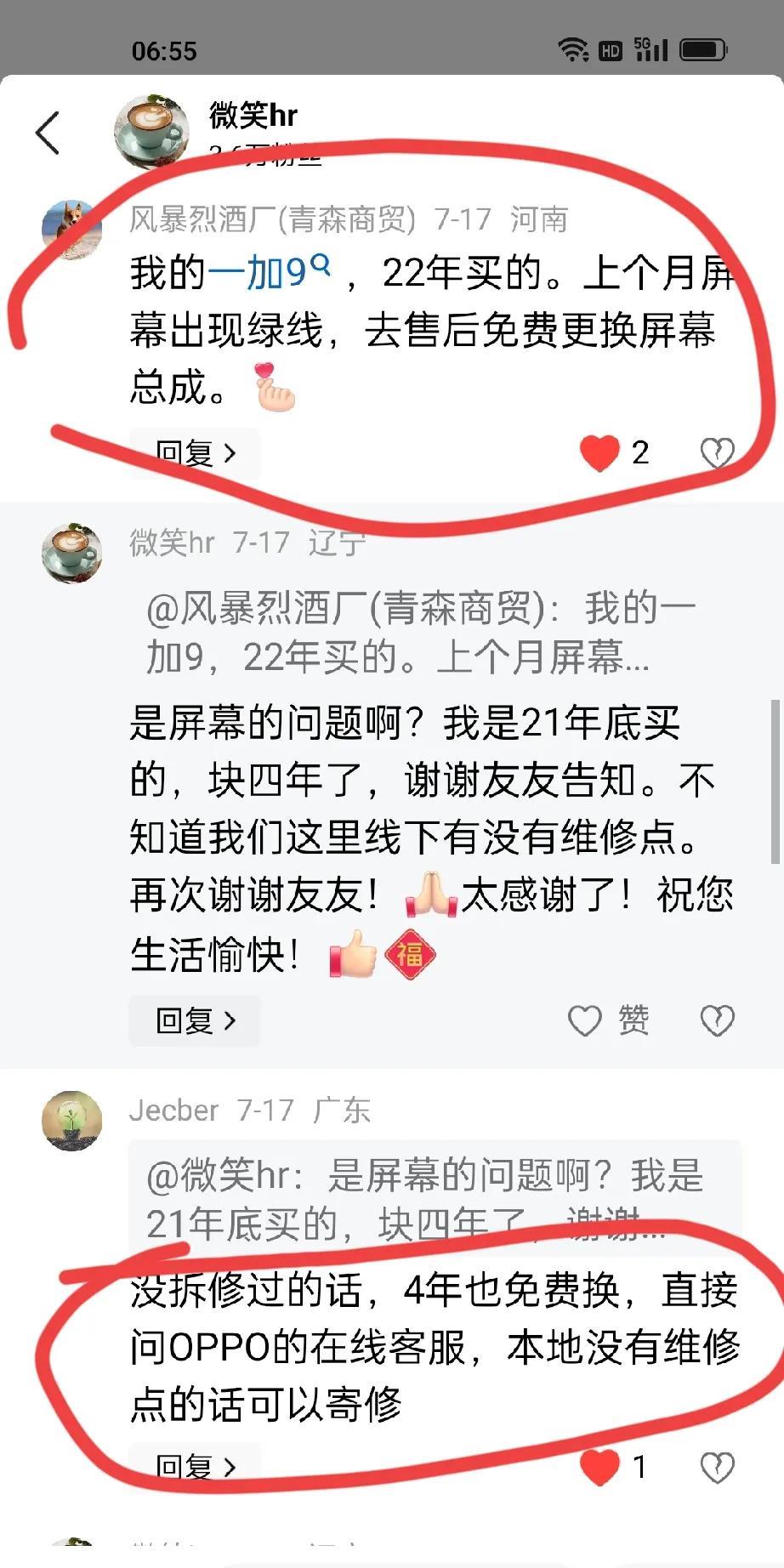 没想到,我给友友的一条留言,换来20多条的回复,友友们帮助我解决了难题,他们的热忱深深打动了我。 手机有故障了。前天早上,我正在看手机,忽然就觉得眼前一闪,接着奇怪的事情就发生了,手机屏幕中间地方出现一道绿色竖线。 我赶紧上网查查是怎么回事,怎么能消除这条绿线。有人说手机重启。我重启以后,绿线还在。还有人说更新手机数据,恢复出厂设置。我随后更新数据,绿线还没有消除。至于恢复出场设计,我没敢做。 收到反馈。没想到不一会儿,就有友友给我回复了,有人告诉我可以去换屏幕,有人告诉我可以免费换,只要手机从来没有拆过。有人告诉我收据没有了也可以给换屏幕。有人告诉我一加手机和oppo是一家,线下有维修点。 找到实体店。一下子收到这么多的好消息,令我非常高兴。昨天下午,我就去找oppo店面。因为我知道有一条街是专门卖手机的,就去那里找。不费吹灰之力,就被我找到了。店面oppo字幕很明显,下面橱窗玻璃上面,印有小字,一加手机。当时把我高兴坏了,赶紧走进去询问。 解决问题。店内工作人员,听了我的叙述,拿过手机,又在电脑上一番操作,问了我的电话号码。然后对我说,如果发现手机没有拆除,可以免费更换屏幕。他已经联系了屏幕,五天左右能到。让我回家等电话。就这么简单,我的问题就解决了。 我今天在这里,真心谢谢那些帮助我的朋友们。没有你们的留言,我真的不知道怎么办。你们的留言,不但解决了我的手机问题,还让我增长了知识。知道了很多关于一加手机的知识。以前我总以为,一加手机都是网上销售,线下没有服务中心。通过这次知道了,知道它和oppo是一家的。 #晒图笔记大赛#