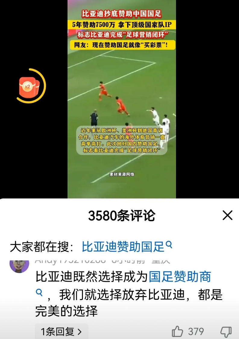 球迷对国足失望透顶,国足管不了,就抵制赞助商。很多人表示,本来打算买比亚迪,这回有理由不买了。
