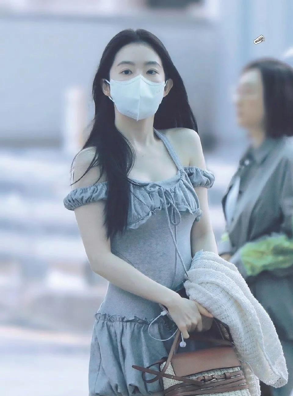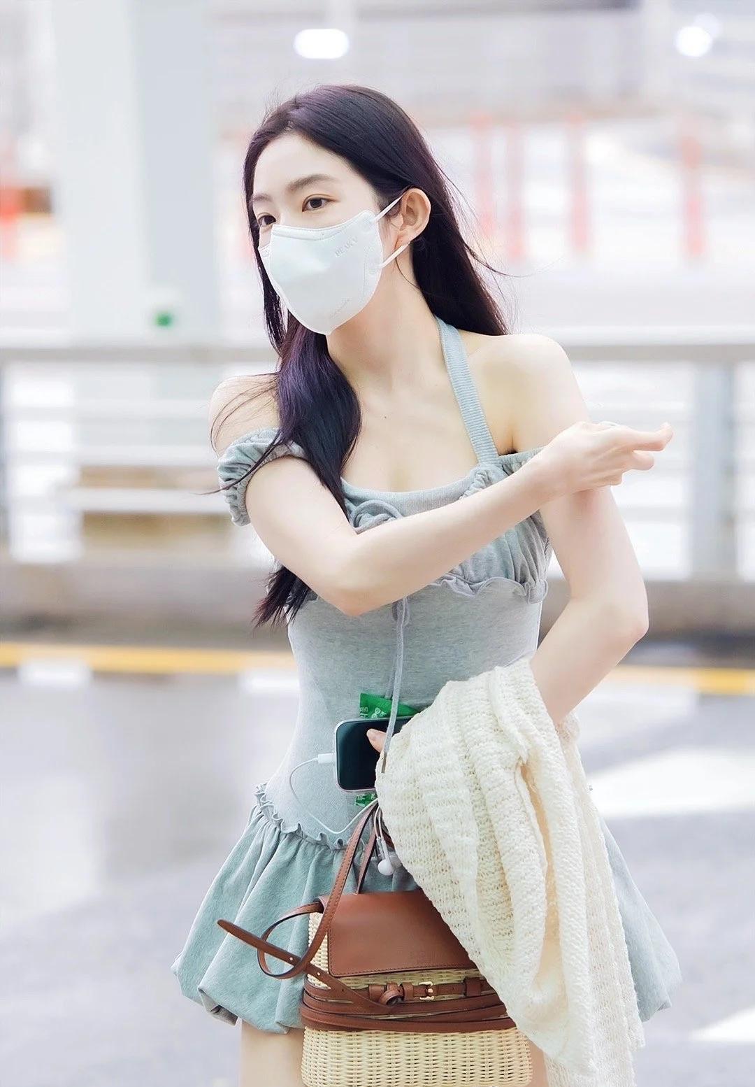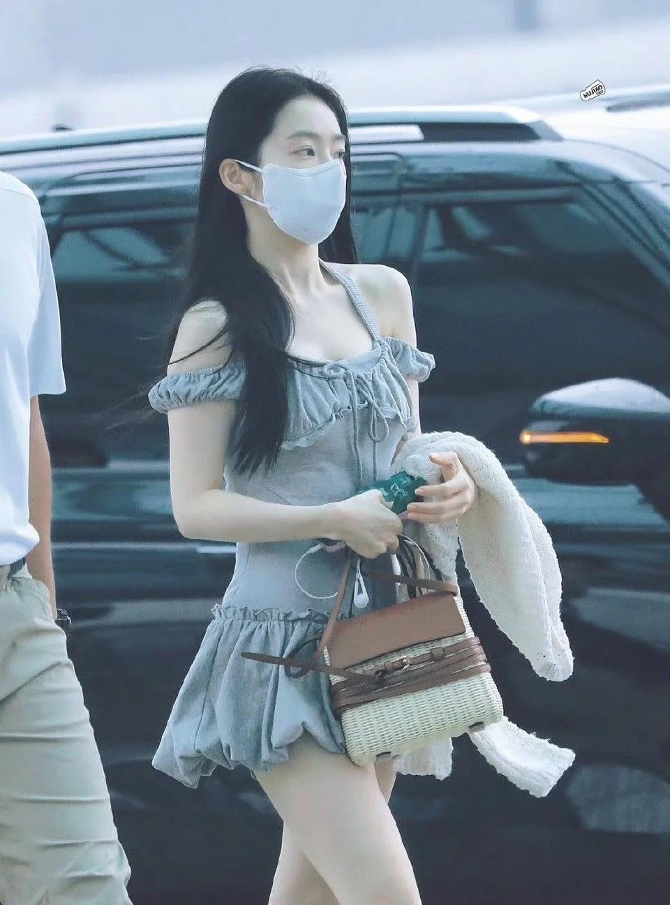 裴珠泫街拍,纯欲风短裙配中筒袜和乐福鞋,乖巧甜美! 短款的挂脖连衣裙,大领口修身