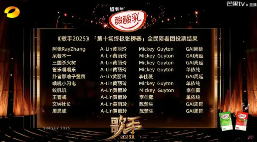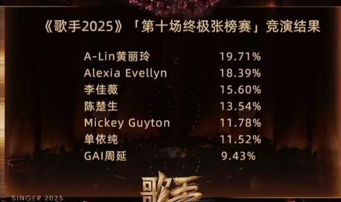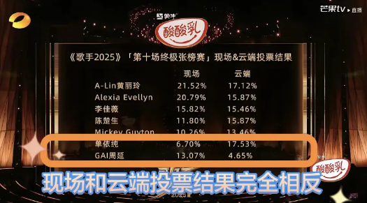 单依纯险些被淘汰!昨晚的《歌手2025》第十期 ,单依纯翻唱孙燕姿的《开始懂了》,表现一般,被重新杀回来的林志炫以一首彭佳慧原唱的超高难度歌曲《太难唱了》挑战她成功,最终单依纯在现场观众得票率仅为6.70%,断崖式落后于其他歌手,甚至比最终排名倒数第二的GAI的13.07%低了一半还多,但“云端听申”却投给她最多的票,以17.53%队得票率排名第一,这些票“拯救”了她,最终,她勉强超过了GAI,成为本期“副班长”,保住了席位,自嘲“苟”到现在的GAI,这次终于被淘汰了。
