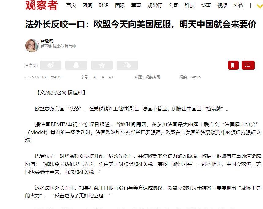 好家伙!法国外长这嘴可真敢说啊!美国都要对欧盟加 30% 的关税了,他不琢磨着怎么跟美国叫板,反倒急吼吼地扯出中国来:“今天对美国低头,明天中国就会来要价”,这泼脏水的速度也太快了吧! 特朗普放话 8 月 1 号就加税,还说欧盟企业去美国建厂就能免掉,这明摆着是逼人低头。 欧盟内部立马炸了锅,吵得不可开交。 欧盟委员会这边左右为难,一边说要反制,一边又想跟美国好好谈,连反制清单都拖到 8 月 6 号了,原来 950 亿欧元的规模也砍到 720 亿,一眼就看出里头意见多乱。 德国、意大利都犯嘀咕,怕把特朗普惹急了,自家汽车、出口生意受影响。 可法国偏不,外长巴罗在雇主会上放狠话,说对美国服软就是坏了规矩,欧盟脸都要丢尽了,真逼急了就得反击。 马克龙也跟着表态,说对美国这事儿特不满,支持硬刚到底。 经济部长隆巴尔也吐槽,跟美国谈判太费劲,对方给的条件根本不公平,谈崩了就得对等加税,不然太亏。 转头巴罗又扯到中国,说什么 “产能过剩”,怪中国让欧洲厂家活不下去。 这话说的,中国外交部早怼回去了,我们产业起来靠的是技术创新、供应链全,真刀真枪拼出来的,哪靠什么补贴? 新能源产业还帮着全球应对气候变化呢,说白了就是他们自己怕比不过,想搞保护主义,心里发虚罢了。 中国态度一直明明白白,关税战没赢家,保护主义坑人坑己,大门只会越开越大,跟世界一起挣钱。 谁都看得出来,法国把中国拉出来说事儿,无非是想在欧盟内部多拉点人,让自己硬气的立场站得住脚。 现在这局面就像拔河,美国使劲拽,欧盟这边有的想松劲有的想较劲,真闹起来谁都没好果子吃。 美国消费者可能要面对涨价缺货,欧盟企业也得遭殃。