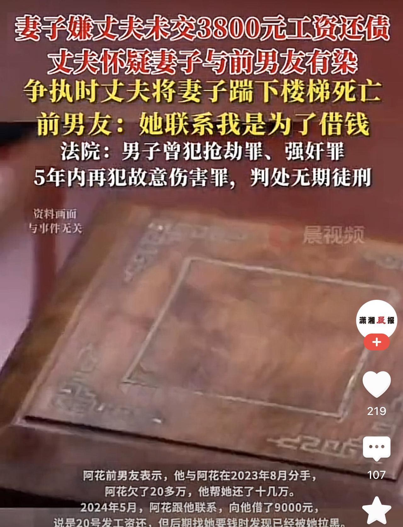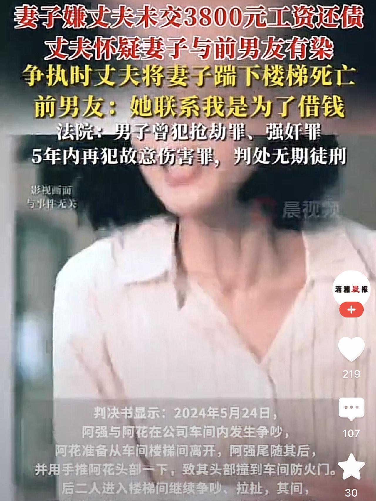 浙江金华,男子刚发了一个月的工资3800元,结果就被妻子讨要,两人因此在供公司车间发生了争执,男子怀疑妻子和前男友有染,于是便将其一脚踹下楼,最终妻子抢救无效去世,事发后,男子却只被判了无期。 阿强之前有过作奸犯科的履历,但是妻子阿花却不离不弃,刑满释放后,两人就在一家工厂上班。 到了月底,阿强发了工资3800元,正当阿强打算拿这笔钱好好犒劳一下自己时,结果妻子阿花却要求阿强把工资上交,毕竟在外还有很多债要还。 然而,阿强却觉得是妻子要拿钱和前男友约会,于是两人就发生了争执,阿强一脚将阿花从楼梯上踹了下去,导致阿花头部着地不省人事,事发后,阿花抢救无效去世。 而阿花前男友表示,两人早已经分手了,因为阿花之前在外欠着钱,自己还帮着还了10多万,事发前,阿花联系自己要借钱,自己又借给她9000元,她说等月底还,结果到了月底要钱时发现自己被拉黑。 最终,法院判决阿强构成故意伤害罪,因为有前科,最终被判处了无期徒刑。 从民事法律责任角度来看,阿花的离世给其家庭带来了巨大的损失。 依据《民法典》第一千一百七十九条规定:“侵害他人造成人身损害的,应当赔偿医疗费、护理费、交通费、营养费、住院伙食补助费等为治疗和康复支出的合理费用,以及因误工减少的收入。造成残疾的,还应当赔偿辅助器具费和残疾赔偿金;造成死亡的,还应当赔偿丧葬费和死亡赔偿金。” 阿强的暴力行为直接导致阿花死亡,其家属依法向阿强主张这些赔偿是合理合法的。但是赔偿也只限于直接赔偿,而非间接赔偿。 从刑事责任角度分析,阿强的行为构成故意伤害罪。 根据《刑法》第二百三十四条规定:“故意伤害他人身体的,致人死亡或者以特别残忍手段致人重伤造成严重残疾的,处十年以上有期徒刑、无期徒刑或者死刑。” 阿强在与阿花争吵过程中,故意用脚踹阿花,致其从楼梯摔下受伤并最终死亡,其行为符合故意伤害罪的构成要件。 此外,阿强还有抢劫罪等前科,刑满释放后五年内再犯故意伤害罪,属于累犯。《刑法》第六十五条规定:“被判处有期徒刑以上刑罚的犯罪分子,刑罚执行完毕或者赦免以后,在五年以内再犯应当判处有期徒刑以上刑罚之罪的,是累犯,应当从重处罚。” 基于此,法院在量刑时对阿强从重处罚,最终判处他无期徒刑。 实际上,阿强只是踹了阿花一脚致其死亡,如果是连续击打,那么就不是故意伤害了,而是故意杀人行为了。 最终,这起悲剧也给我们敲响了警钟,夫妻之间应相互信任、相互理解,遇到问题时应冷静沟通,而不是任由情绪失控,用暴力解决问题。 对此,你对本案有什么看法? —————————— 关注我,带你评析法律热点,关注冷暖人生。 文章原创,抄袭必究