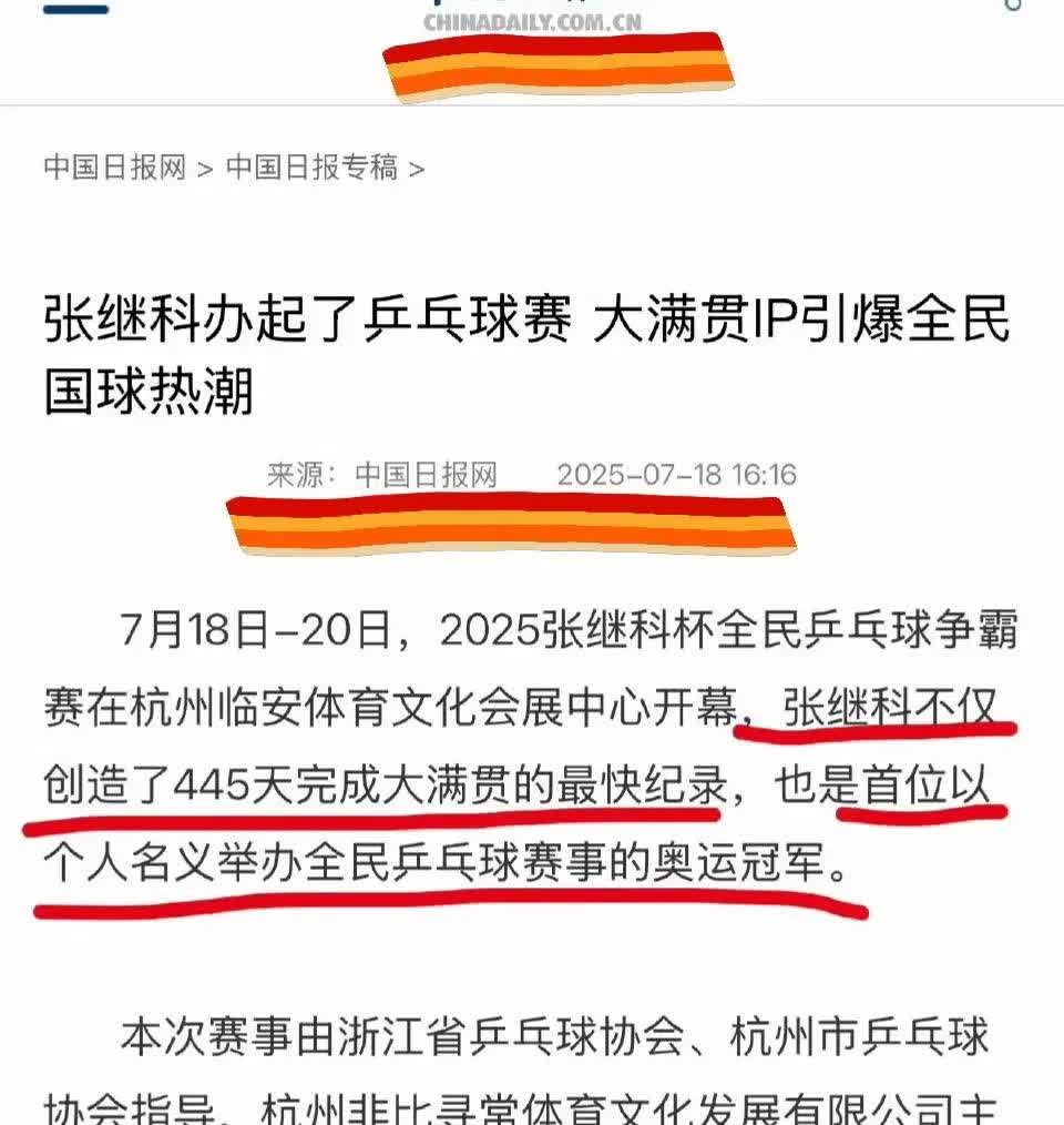狠狠打了多少人的脸! 没想到,一场普通的球赛居然得到了人民日报、中国日报同时报道,报道中还提到张继科是首位以个人名义举办全民乒乓球赛事的奥运冠军。这无疑是对张继科一种极大的肯定和认可! 没想到,一场普通的球赛,原国家体育总局副局长蔡振华会出现在球赛开幕式上。不过,要相信最好的师徒从不会走散!当蔡局一脸骄傲的说出:这是我的爱徒张继科。一句来自恩师的肯定,证明当年所做的一切,都是有意义的! 没想到,一场仅仅以个人名义举办的民间球赛,报名人数居然能一度超过1200人,直接引爆全民国球热潮。足以可见张继科影响力之大。都说群众的眼睛是雪亮的,是非对错,大众心中自有评判! 没想到,从不忘初心!张继科说以自己的名字命名比赛,是想通过自身的影响力让更多的人参与比赛,希望乒乓球这项运动的氛围越来越好! 最后相信,张继科杯比赛会一届一届办下去,越办越好!