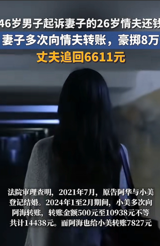 “太炸裂!”辽宁,一40岁已婚女子,在KTV看上26岁小伙,便谎称自己单身,还当场给小伙转账1216块,事后两人发生关系并经常幽会,女子为小伙花了8万多!女子46岁丈夫得知后大怒,要求小伙还钱却遭拒,双方闹到法庭,法院判决令人意外! 根据7月17日潇湘晨报的报道,丈夫发现妻子最近真的很不正常,因为已经40多岁的妻子,不可能每天出去的那么勤快,甚至有时候还经常夜不归宿,或者动不动的就出去旅游,察觉到异样的丈夫,经过自己的调查,竟然从妻子手机里发现了她出轨了! 看着手机内的一些聊天内容,丈夫十分的愤怒,因为自己的妻子竟然瞒着他,在出轨的这些时间内,前前后后总共给这位名叫阿海的男子身上,花费了8万多元! 看着这笔金额,丈夫十分的生气,因为这笔财产是他和妻子的婚内共同财产,妻子根本没有权利私自的给予他人,又遭到了妻子的背叛,丈夫觉得自己经营了这么多年的夫妻生活,算是走到头了! 其实妻子小美早在2024年的时候,在和几个朋友相约下来到了一家KTV,经过朋友的介绍,她的其中一位朋友将年轻的阿海带到了她们的包间,看着年纪轻轻的阿海,小美十分的喜欢,便一直和阿海说话,并且添加了联系方式。 在酒局结束之后,小美主动给阿海转了1216元,让阿海前去将包间当晚的消费给结了,然而阿海知道用不了这么多,然而小美却表示,多余的钱就当做请阿海吃宵夜了! 在接下来的时间内,小美多次的约阿海,不是外出逛街就是约着吃饭和看电影,并且在逛街的过程中,小美不停的给阿海挑选他合适的衣服,只要穿在身上好看的,不论多少钱,小美都直接给阿海支付了衣服的金额! 随着时间的流逝,阿海还是没有抵挡住小美的攻势,因为小美告诉阿海自己单身好久了,自从被上一个男朋友骗过之后,就再也没有谈过恋爱,随即俩人便发生了关系,走在了一起! 但是这件事还是被小美的丈夫所发现,在丈夫得知妻子给阿海花费了这么多钱,直接找到了阿海想让对方将这笔钱给还了,但是阿海却表示,这些钱自己并没有拿在手中,而是外出吃饭,买东西全部和小美一同花费的! 听到对方不愿意归还这笔钱财,丈夫直接将阿海告上了法院,想要让阿海将这笔钱财还给他,然而经过法院的多方面调查,其丈夫提供的转账记录证据,只有14438元,另外阿海也给小美转了7827元,最终法院判决阿海偿还其丈夫6611元! 那么,对于这件事,大家有什么看法? 信源:潇湘晨报