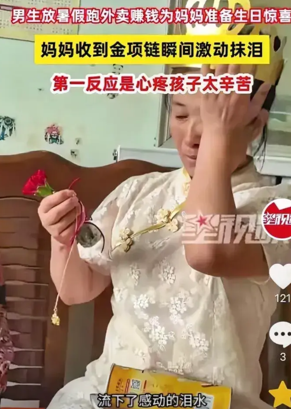 母亲笑着打开桶盖,扯出的却是一朵拴着金项链的玫瑰。 看着刚结束午高峰送单,安全帽下的头发还滴着汗的儿子,母亲潸然泪下。