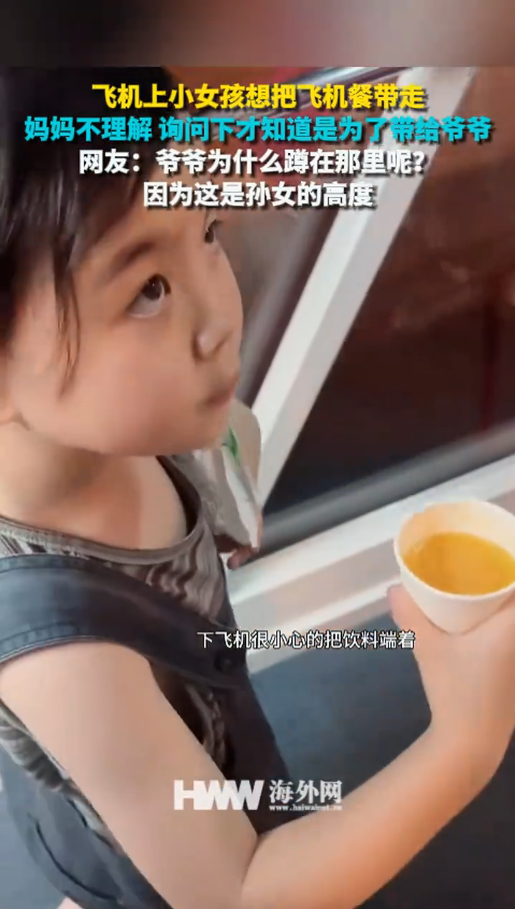 信息来源:《飞机上小女孩想把飞机餐带走 妈妈不理解 询问下才知道是为了带给爷爷 网友:爷爷为什么蹲在那里呢?因为这是孙女的高度》海外网
