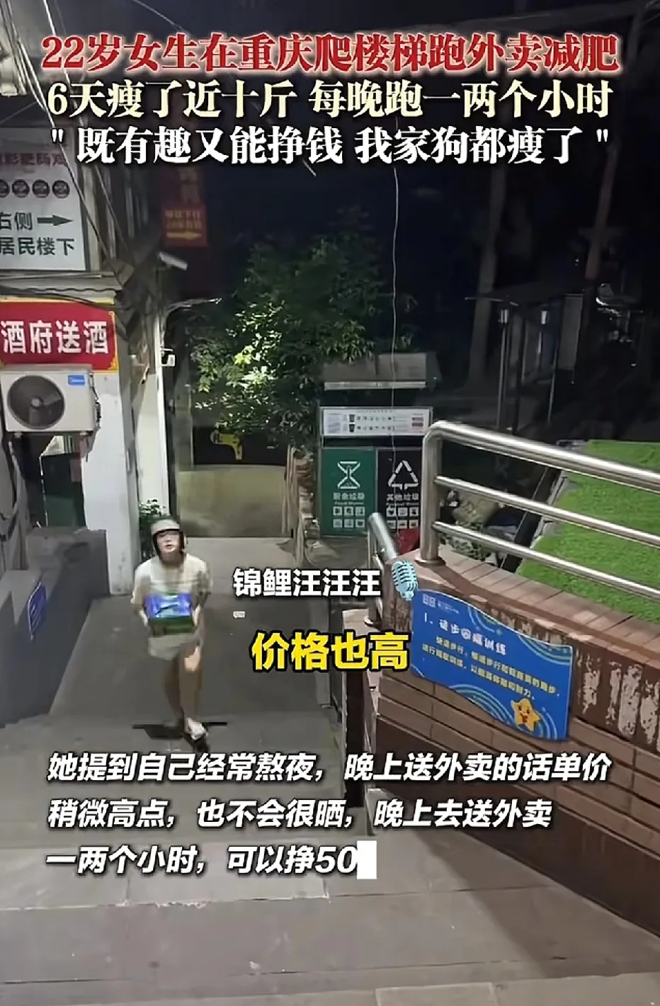 重庆,22岁女子减肥,每天的运动时间很枯燥,又难熬,她灵机一动尝试着去送外卖,每天晚上送一到两个小时的外卖,能赚50-120元。 女子送了六天的外卖,体重降了十斤。 女子高兴的与网友分享:“夜幕降临时我开始送外卖, 晚上单价高,又晒不到,本身我是个夜猫子,睡的晚,送外卖既能赚到钱,又能瘦身,回到家后晚餐都不用吃了,累的倒头就睡,我很享受这样的感觉。”