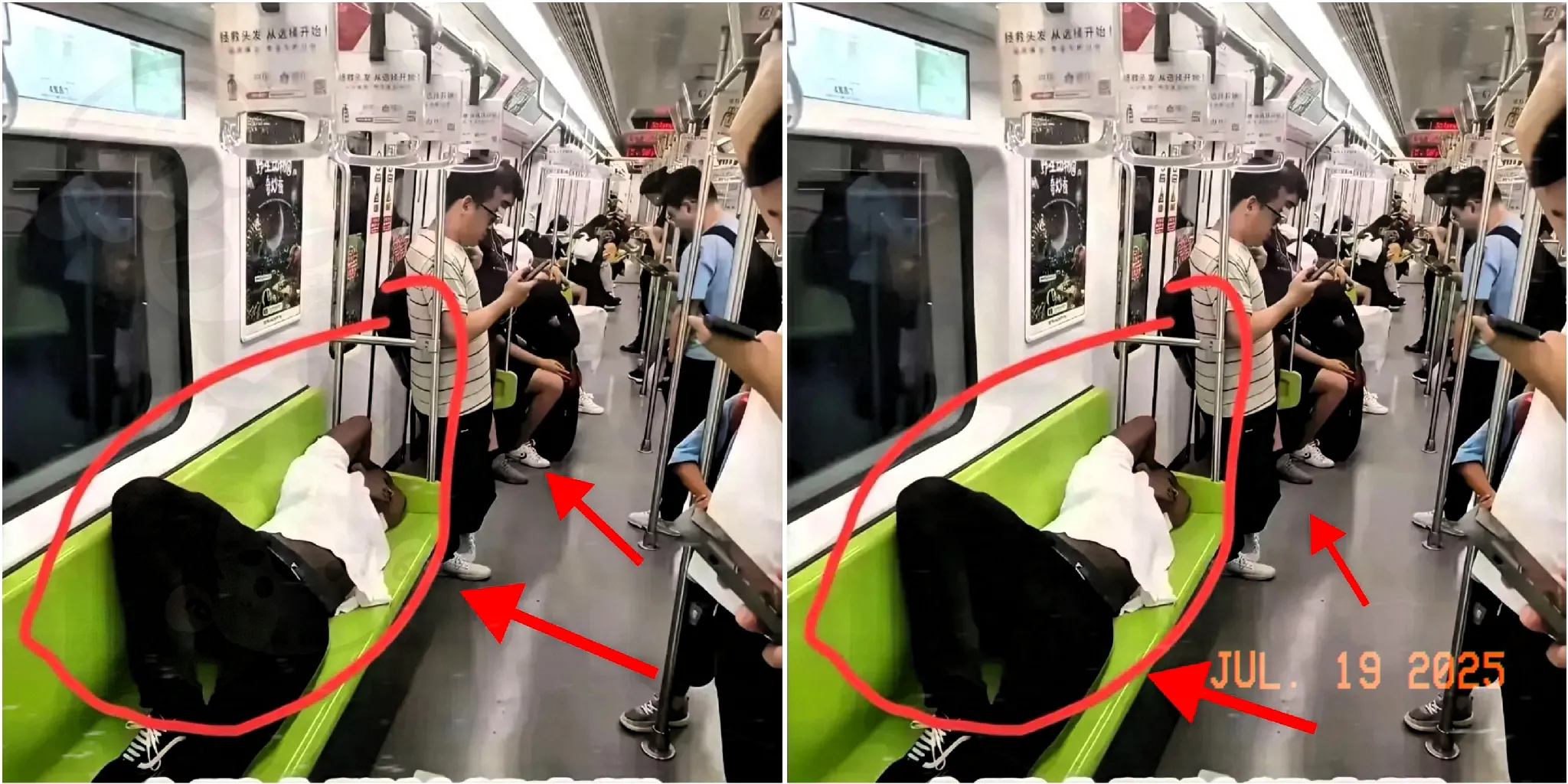 公共场合讲究文明不分肤色,座位是给大家轮流用的,不是谁的专属躺椅。