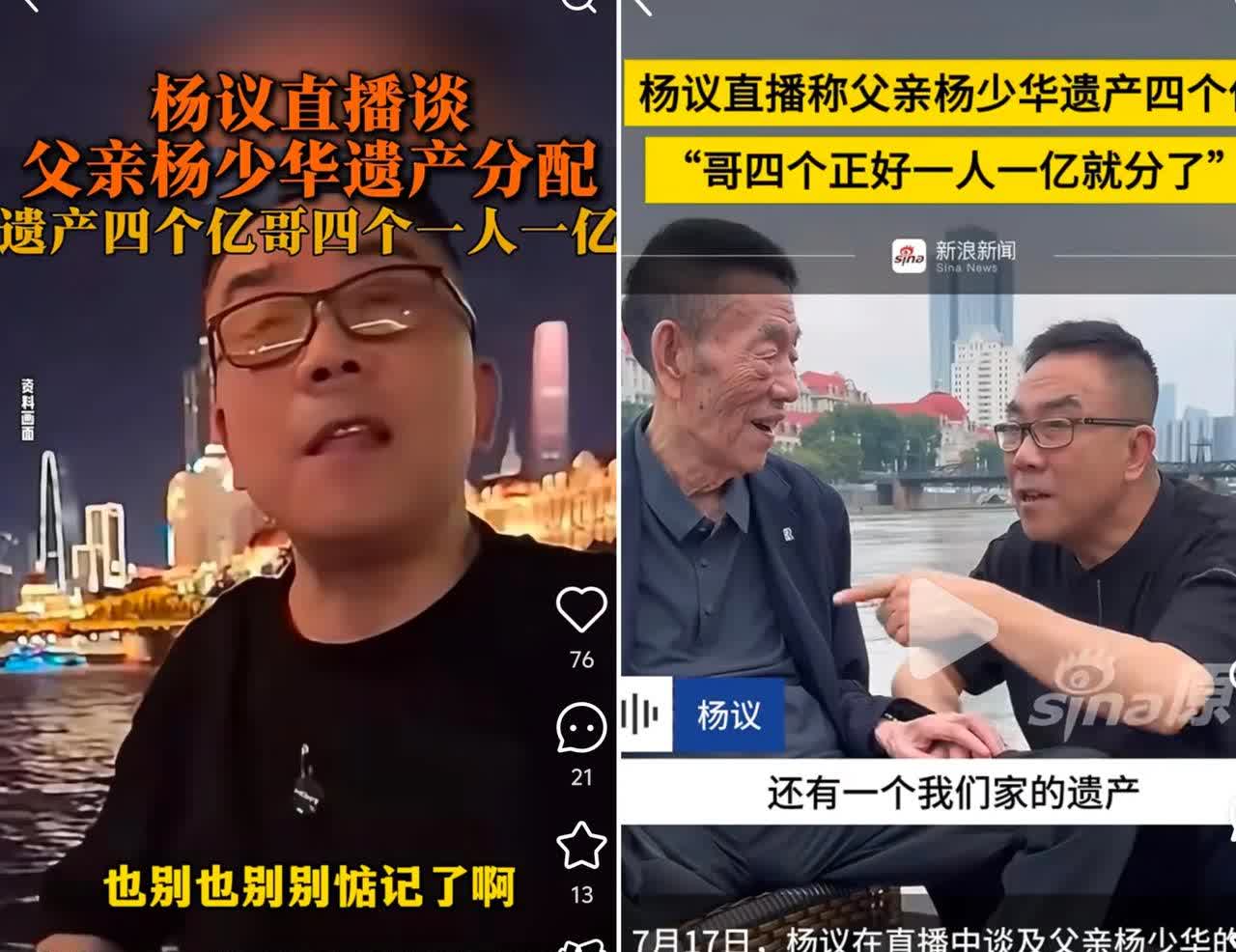 杨议这次失算了, 本来想靠开玩笑打消众人猜疑,结果没想到,大家真的信了杨少华遗产有这么多… 遗产这个话题最近太高频了, 杨老爷子作为老艺术家奋斗了几十年, 直到生命最后一天还在挣钱, 如果说他没点资产那肯定不可能。 但是说有几个亿,那我还真不太信[捂脸] 他又不是流量明星,片酬千万,代言费百万。 上一辈的人,哪有这么多的财富积累呢? 这四个亿,应该是记忆、回忆、失忆,还有这个儿子杨议吧[笑哭][笑哭] 你们觉得他这是开玩笑还是真的呢?