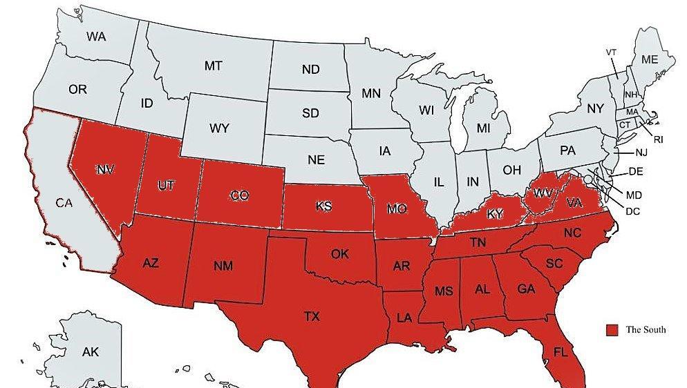 美国哪些地区属于“南方国家”,来自不同地区的人看法不同,欧洲人认为,第一张地图上的红色地区都是,但美国人认为,第二张图的红色地带才属于“南方国家”,也就是1861年内战时期的南方,并不包括中西部;而墨西哥人、拉丁美洲人则认为,按中间线划分,第三张图的红色地带才是真正的“南方国家”,却又不包括加利福尼亚。实际上,结论不同是基于对历史、文化、地理甚至是经济的认知差异,并且与美帝国的西进运动有直接关系。