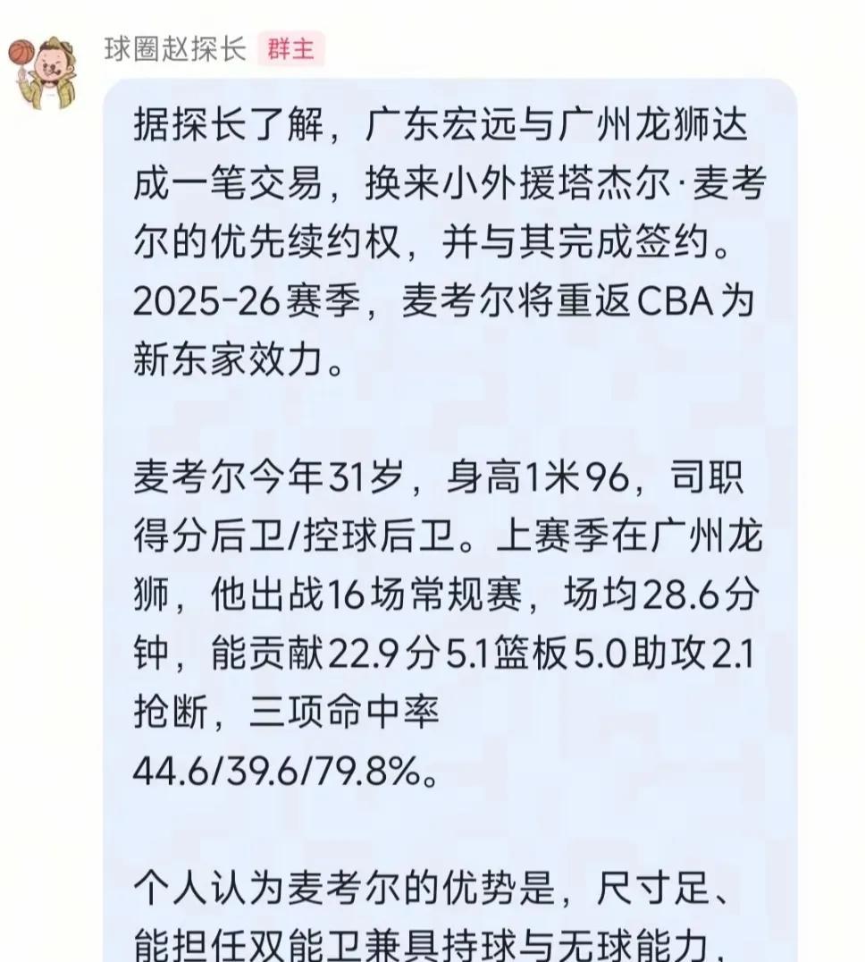 前广州龙狮外援麦考尔将加盟广东队! 来自媒体人“球圈赵探长”透露的消息源,广东队