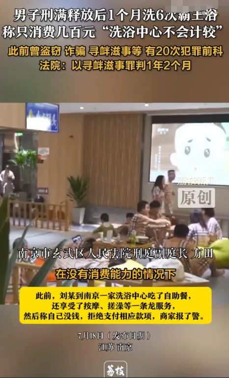 白嫖上瘾?江苏南京,男子刑满释放后,去洗浴中心享受按摩、搓澡等服务,1个月的时间去了6次,每次都说没钱,老板忍无可忍选择报警。结果悲剧了,男子被以涉嫌寻衅滋事罪提起公诉。法院在审理时还发现,男子还曾11次犯盗窃罪,3次犯诈骗罪,6次犯寻衅滋事罪。 2024年11月,刘某走出监狱大门,本应是重新开始的机会,但一个月后,他却因连续6次在洗浴中心“霸王消费”再次站上被告席。 这一次,法院以寻衅滋事罪判处他有期徒刑1年2个月,还得退赔所有商家的损失。 刘某的操作并不复杂,在南京一家洗浴中心,他先是享用了自助餐,接着体验了按摩、搓澡,一套“一条龙”服务下来,结账时却摊开手说自己没钱。 商家没办法,只能报警,民警一查才发现,这不是刘某第一次这么干,从2024年11月刑满释放到12月案发,短短一个月里,他穿梭在南京、淮安两地的洗浴中心,用同样的套路消费了6次。 每次都是吃完、洗完、按完,就以“没钱”为由拒绝付款,累计涉案金额2500元,被抓后,刘某还满不在乎地说,每次就几百块,他们不会较真的。 可他忘了,自己的“前科”早就堆成了山,警方调查显示,刘某此前有11次盗窃罪、3次诈骗罪、6次寻衅滋事罪的记录,堪称“惯犯”。 这次刚出狱就连续作案,显然没把法律当回事,和刘某形成对比的,是另一位叫戴某的男子。 戴某因贩卖毒品被判了15年,服刑期间,法院发现他没缴罚金,但查来查去,他名下确实没什么可供执行的财产,这事就拖了12年。 2025年2月,刑满释放的戴某想坐高铁出门,却被告知自己在失信名单上,买不了票。 但戴某没像刘某那样耍赖,他主动打给法院的承办法官,听完法官解释“没缴罚金会被限制高消费”的法律规定后,当天就赶到法院,把欠的罚金一次性缴清了。 法官当场给他签了解除限制的文件,他握着文件说,谢谢法院给我机会,我肯定好好过日子。 同样是出狱后遇到问题,刘某选择用“耍横”的方式占便宜,戴某却用“主动补错”争取机会。两种态度,最终换来了两种结果。 法院对刘某的判决,并非只看那2500元的涉案金额,法官在审理时提到,刘某明知自己没钱,还故意多次去洗浴中心消费,不仅让商家受了损失,还扰乱了正常的经营秩序,这已经构成了寻衅滋事罪。 再加上他之前多次犯罪、屡教不改,按照法律规定,必须从重处罚。 而戴某的事,法院的处理也透着“人情味”,法官没有因为他“拖了12年没缴罚金”就一棍子打死,而是在他主动补缴后,立刻解除限制。 用承办法官的话说,法律既要守住底线,也得给愿意改错的人留条路。