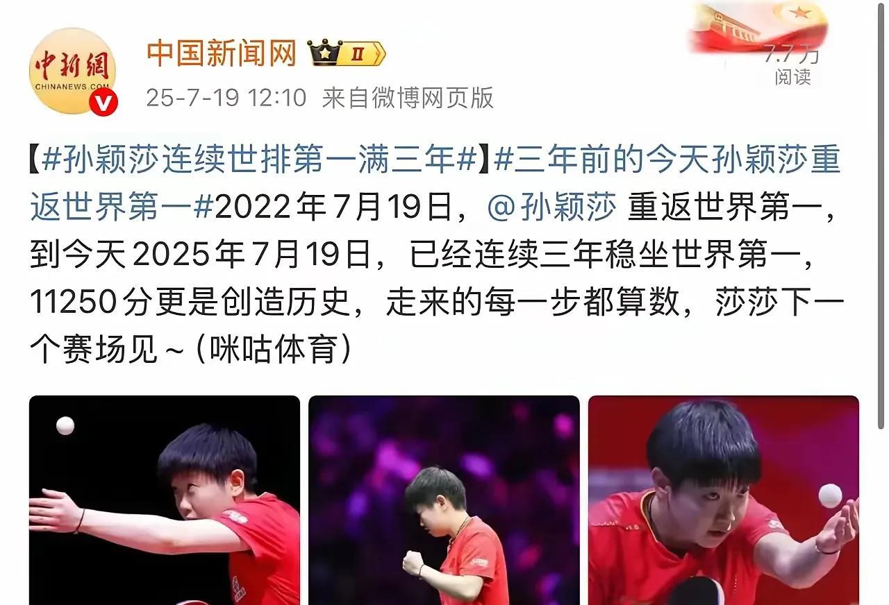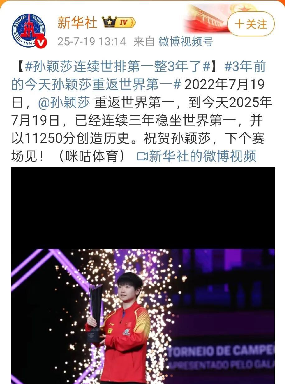媒体发文祝贺孙颖莎世排第一满3年,莎莎现在积分11250,在女单排行榜断崖式领先